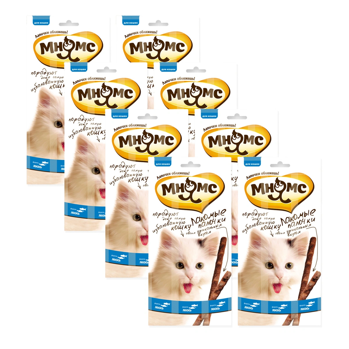 Мнямс лакомые палочки 13,5 см для кошек с лососем и форелью 3х5 г. Мнямс лакомые палочки для кошек с лососем и форелью станут любимым угощением для вашего питомца. Кроме того, что каждая палочка содержит высококачественные морепродукты, в ее состав также входят и продукты растительного происхождения, которые гарантировано подарят кошке здоровый вид. Стандартная упаковка содержит 3 палочки. Вес каждой из них – 5 г. Размер упаковки – 13,5 см.
