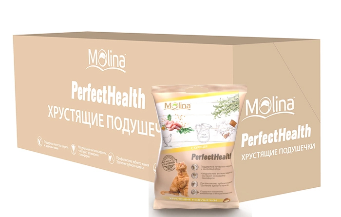 Хрустящие витаминизированные подушечки для кошек "Со вкусом курицы"Витаминизированные подушечки со сливочной начинкой!Molina PERFECTHEALTH хрустящие подушечки для кошек - это натуральное и полезное лакомство со вкусом курицы и сливочной начинкой. Лакомство содержит ТАУРИН и микроэлементы для профилактики зубного камня и поддержки качества шерсти. Натуральный и вкусный продукт, без искусственных добавок, красителей, ГМО и усилителей вкуса, идеален для поощрения, игры и перекуса. Рекомендации по кормлению и прочая информация:Для котят и взрослых кошек весом до 2,5 кг - до 6 подушечек в сутки, для кошек весом более 2,5 кг - до 12 подушечек в сутки.Суточный рацион кошки зависит от ее образа жизни, возраста, состояния здоровья.Свежая питьевая вода должна быть всегда доступна кошке.Хранить в сухом и прохладном месте. После вскрытия хранить в плотно закрытой упаковке не более 4х недель.Не предназначено для употребления в пищу человеком. Продукт является дополнением к основному рациону питомца.