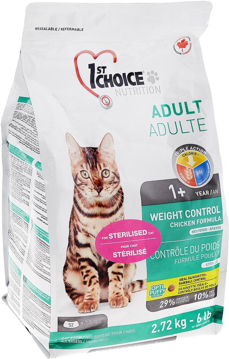 Корм сухой 1st Choice "Adult" с курицей разработан специально для стерилизованных и кастрированных животных, а также склонных к полноте. Низкокалорийный корм поддерживает идеальную форму. У кастрированных и стерилизованных кошек более низкий энергетический уровень обмена веществ и потребность в калориях. Низкое содержание жира в корме способствует снижению массы тела без сокращения нормы кормления. Снижение уровня активности кошки с возрастом может способствовать набору лишнего веса, эта формула удобна во всех случаях, когда необходимо ограничить количество калорий в рационе.рН - контроль помогает снизить риск образования камней в мочевыделительной системе. Клетчатка обеспечивает ощущение сытости и улучшает пищеварение. Ингредиенты: свежая курица 16%, мука из мяса курицы 16%, рис, гороховый протеин, коричневый рис, специально обработанные ядра ячменя и овса, мякоть свеклы, клетчатка гороха, гидролизат куриной печени, куриный жир, сохраненный смесью натуральных токоферолов (витамин Е), сушеная мякоть томата, цельное семя льна, лецитин, калия хлорид, холина хлорид, соль, кальция карбонат, кальция пропионат, натрия бисульфат, таурин, DL- метионин, L-лизин, экстракт дрожжей, железа сульфат, аскорбиновая кислота (витамин С), экстракт цикория, цинка оксид, натрия селенит, альфа-токоферол ацетат (витамин Е), глюкозамина сульфат, никотиновая кислота, экстракт юкки Шидигера, хондроитина сульфат, L-цистин, кальция иодат, марганца оксид, L- карнитин, D-кальция пантотенат, тиамина мононитрат, рибофлавин, пиридоксина гидрохлорид, витамин А, холекальциферол (витамин Д3), биотин, сушеная мята 0,01%, сушеная петрушка 0,01%, экстракт зеленого чая 0,01%, цинка протеинат, витамин В12, кобальта карбонат, фолиевая кислота, марганца протеинат, меди протеинат. Гарантированный анализ: сырой протеин мин. 29%, сырой жир мин. 10%, сырая клетчатка макс. 6%, влага макс. 10%, зола макс. 9%, кальций мин. 1%, фосфор мин. 0,8%, марганец макс. 0,1%, таурин 2100 мг/кг, витамин А мин. 34 000 МЕ/кг, витамин Д3 мин. 2 000 МЕ/кг, витамин Е мин. 150 МЕ/кг. Товар сертифицирован.