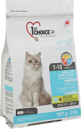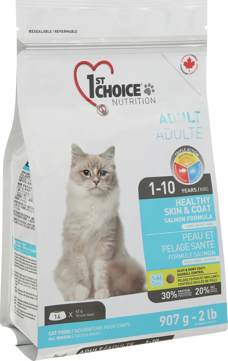 Корм сухой 1st Choice "Здоровая кожа и шерсть" разработан для улучшения состояния кожи и шерсти взрослых кошек в любое время года, шерсть любой длины становится мягкой и блестящей. Жир лосося является лучшим источником Омега 3-6-9 жирных кислот, обеспечивающих здоровье кожи. Сочетание рыбного белка и рыбьего жира гарантирует здоровую и роскошную шерсть. Свежий лосось - главный ингредиент, который понравится даже самым привередливым гурманам. Ингредиенты: свежий лосось 18%, мука из сельди менхаден 17%, рис, гороховый протеин, куриный жир, сохраненный смесью натуральных токоферолов (витамин Е), сушеное яйцо, мякоть свеклы, клетчатка гороха, гидролизат куриной печени, коричневый рис, специально обработанные ядра ячменя и овса, цельное семя льна, жир лосося, сушеная мякоть томата, калия хлорид, лецитин, кальция карбонат, холина хлорид, соль, кальция пропионат, натрия бисульфат, таурин, DL- метионин, L-лизин, экстракт дрожжей, железа сульфат, аскорбиновая кислота (витамин С), экстракт цикория, цинка оксид, натрия селенит, альфа-токоферол ацетат (витамин Е), никотиновая кислота, экстракт Юкки Шидигера, L-цистин, кальция иодат, марганца оксид, L-карнитин, D-кальция пантотенат, тиамина мононитрат, рибофлавин, пиридоксина гидрохлорид, витамин А, холекальциферол (витамин Д3), биотин, сушеная мята 0,01%, сушеная петрушка 0,01%, экстракт зеленого чая 0,01%, цинка протеинат, витамин В12, кобальта карбонат, фолиевая кислота, марганца протеинат, меди протеинат. Гарантированный анализ: сырой протеин мин. 30%, сырой жир мин. 20%, сырая клетчатка макс. 6%, влага макс. 10%, зола макс. 9%, кальций мин. 1,2%, фосфор мин. 1%, марганец макс. 0,1%, таурин 2600 мг/кг, витамин А мин. 34 000 МЕ/кг, витамин Д3 мин. 2 000 МЕ/кг, витамин Е мин. 150 МЕ/кг, омега-3 жирные кислоты 1,92%, омега-6 жирные кислоты 9,19%, омега-9 жирные кислоты 0,26%. Энергетическая ценность: 455 ккал/мерный стакан/250 мл - 3639 ккал. Товар сертифицирован.