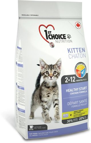 Сухой корм 1st Choice "Здоровый старт" с идеальной формулой для начального прикорма предназначен для котенка с 2 месяцев, когда он нуждается в новых источниках питания вместо материнского молока. При этом нет необходимости разделять котенка с мамой. Корм содержит все необходимое не только для растущего организма, но и для беременных и кормящих кошек. Оптимальное питание для старта в здоровую жизнь! Мелкие гранулы легко усваиваются в организме котенка, укрепляя иммунитет, полученный от матери. Входящий в состав жир лосося - самый лучший источник DHA (докозагексаеновой кислоты), которая обеспечивает оптимальное развитие центральной нервной системы, головного мозга и зрения. Пребиотики поддерживают иммунитет и способствуют хорошему пищеварению, кальций - правильному развитию костной системы котенка. DHA развивает центральную нервную систему, головной мозг и зрение. Состав: свежая курица (17%), мука из курицы (17%), рис, куриный жир, гороховый протеин, сухой яичный продукт, мука из менхаден (американской сельди), коричневый рис, ячменная крупа, овсяная крупа, гидролизат куриной печени, мякоть свеклы, гороховая клетчатка, цельное семя льна, рыбий жир из лосося (источник докозагексаеновой кислоты), сушеная мякоть томата, калия хлорид, соль, кальция карбонат, дрожжевой экстракт (источник маннан-олигосахаридов), экстракт цикория (источник инулина), экстракт юкки Шидигера, сушеная мята (0,01%), сушеная петрушка (0,01%), экстракт зеленого чая (0,01%). Добавки: Питательные добавки: E672 (витамин А) 34000 МЕ/кг, E671 (витамин D) 2000 МЕ/кг, витамин Е 150 МЕ/кг, Е300 аскорбиновая кислота (витамин С) 200 мг/кг, Е1 (железо) 230 мг/кг, Е2 (йод) 4 мг/кг, Е3 (кобальт) 1,5 мг/кг, Е4 (медь) 2 мг/кг, Е5 (марганец) 35 мг/кг, Е6 (цинк) 190 мг/кг, Е8 (селен) 0,1 мг/кг, L-лизин 0,05%, DL-метионин 0,13%. Технологическая добавка: бисульфат натрия 1,5 мг/кг. Анализ: протеин 30%, жир 20%, сырая клетчатка 3%, зола 8%, кальций 1,2%, фосфор 0,96%, магний 0,1%, докозагексаеновая кислота 1200 мг/кг, таурин 2300 мг/кг, маннан-олигосахариды 2000 мг/кг, фрукто-олигосахариды 1000 мг/кг. Товар сертифицирован.
