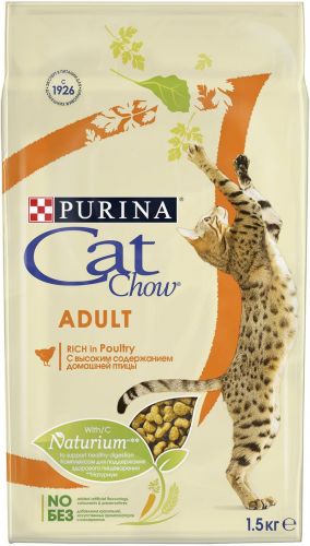 Корм сухой Cat Chow "Adult" - полнорационный, сбалансированный корм, в котором есть все необходимое, чтобы жизнь вашей кошки была здоровой и естественно прекрасной. Корм отличается высоким содержанием домашней птицы и включает Naturium - особое сочетание волокон из натуральных источников, а также источник натурального пребиотика, который поддерживает здоровое пищеварение кошки. Источник высококачественного белка в каждой порции поддерживает оптимальную массу тела. Корм также содержит тщательно отобранные травы и овощи (петрушка, шпинат, морковь). Эти ингредиенты придают особый аромат, который кошки выбирают инстинктивно. Высокое содержание витамина Е улучшает естественную защиту организма кошки. Мякоть свеклы и цикорий поддерживают здоровое пищеварение и уменьшают запах от туалетного лотка. Товар сертифицирован.