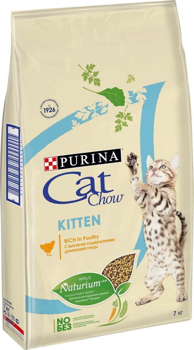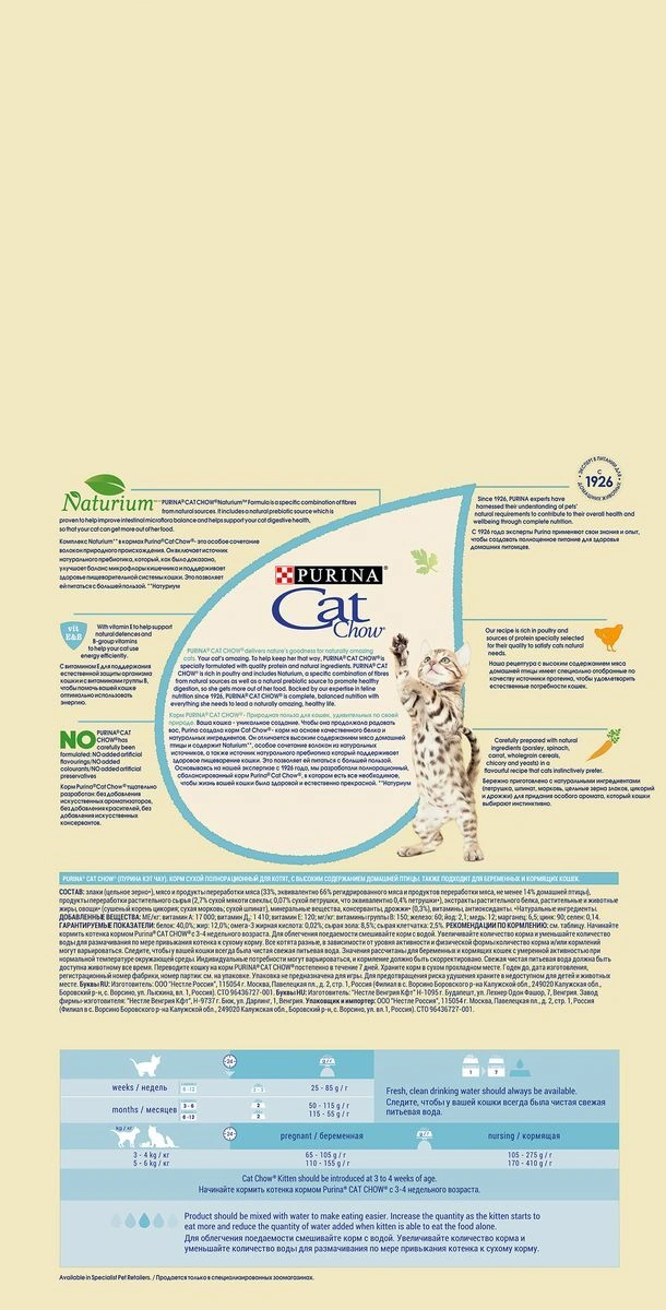 Ваша кошка - уникальное создание.Чтобы она продолжала радовать вас, Purina создала корм Cat Chow - корм с качественным белком и натуральными ингредиентами (петрушка, шпинат, морковь, цельные зерна злаков, цикорий и дрожжи).Он отличается высоким содержанием домашней птицы и включает Naturium -особое сочетание волокон из натуральных источников, а также источник натурального пребиотика, который поддерживает здоровое пищеварение кошки. Это позволяет ей питаться с большей пользой.Основываясь на нашей экспертизе с 1926 года, мы разработали полнорационный, сбалансированный корм Purina Cat Chow, в котором есть все необходимое, чтобы жизнь вашей кошки была здоровой и естественно прекрасной.Состав: злаки, мясо и субпродукты (мясо 14%, курица 4%, индейка 4%), экстракт растительного белка, продукты переработки овощей (сухая мякоть свеклы 2,7%, петрушка 0,4%), масла и жиры, овощи (сухой корень цикория 2%, морковь 1,3%, шпинат 1,3%, зеленый горох 1,3%), дрожжи, минеральные вещества. Натуральные ингредиенты