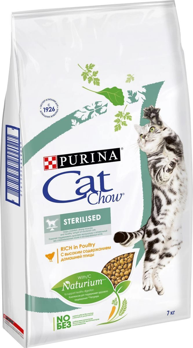 Ваша кошка - уникальное создание.Чтобы она продолжала радовать вас, Purina создала корм Cat Chow - корм с качественным белком и натуральными ингредиентами (петрушка, шпинат, морковь, цельные зерна злаков, цикорий и дрожжи).Он отличается высоким содержанием домашней птицы и включает Naturium -особое сочетание волокон из натуральных источников, а также источник натурального пребиотика, который поддерживает здоровое пищеварение кошки. Это позволяет ей питаться с большей пользой.Основываясь на нашей экспертизе с 1926 года, мы разработали полнорационный, сбалансированный корм Purina Cat Chow, в котором есть все необходимое, чтобы жизнь вашей кошки была здоровой и естественно прекрасной.Состав: злаки, мясо и субпродукты (мясо 14%, курица 4%, индейка 4%), экстракт растительного белка, продукты переработки овощей (сухая мякоть свеклы 2,7%, петрушка 0,4%), масла и жиры, овощи (сухой корень цикория 2%, морковь 1,3%, шпинат 1,3%, зеленый горох 1,3%), дрожжи, минеральные вещества. Натуральные ингредиенты