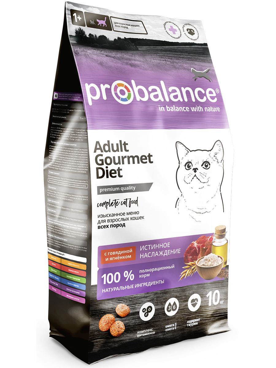 Полнорационный натуральный сухой корм премиум класса для кошек, избирательных в еде. Основной ингредиент корма – мясо двух видов: говядина и ягненок. Рацион рекомендован для ежедневного кормления взрослых кошек всех пород.Корм «Gourmet Diet Adult Beef & Lamb» разработали датские ветеринарные специалисты для требовательных кошек. В состав корма входит сразу два источника животного белка – говядина и ягненок. Мясо говядины и ягненка не только удовлетворяет вкусовые пристрастия привередливых питомцев, но и обеспечивает организм животного незаменимыми аминокислотами, витаминами и минеральными веществами. Специально подобранный пребиотик поддерживает полезную микрофлору кишечника, а глюкозамин и хондроитин помогают сохранить суставы здоровыми.В составе корма нет курицы, поэтому рацион подходит питомцам с аллергией на куриный белок.Probalance – натуральные сбалансированные корма с профилактической функцией без Е- консервантов. Баланс вкуса и пользы для долголетия Вашей кошки.Размер гранулы: диаметр – 10 мм, толщина – 5 мм, форма – круг.Состав: Дегидратированное мясо мин. 25 % (в т. ч. из говядины не менее 8 %), рис, ячмень, протеины растительного происхождения, жир животный, горох, гидролизованный белок из ягненка, натуральные вкусоароматические добавки, жом свекловичный, пивные дрожжи (источник витаминов группы В), льняное семя (источник Омега-3 и Омега-6 жирных кислот), яичный порошок, витаминно-минеральная добавка для кошек (витамины А, D3, Е, В1, В2, В3, В4, В5, В6, В9 (фолиевая кислота), В12, Н (биотин), железо, медь, цинк, марганец, йод, селен), рыбий жир, соль, фито-композиция «Fitocare® for cats», пребиотик, таурин (для здоровья сердца и отличного зрения), лизин (помогает укреплять иммунитет), экстракт Юкки Шидигера (снижает запах фекалий), L-карнитин (способствует сжиганию жиров в организме). Добавки, сохраняющие продукт: мико карб, натуральные антиоксиданты (смесь токоферолов). Энергетическая ценность: 355 ккал / 100 гГарантированные показатели: протеин – 30%, жир – 12%, клетчатка – 3,5%, зола – 8%, влажность – 10%, кальций – 1,8%, фосфор – 1,2%, витамин А - 5000 МЕ/кг, витамин D – 500 МЕ/кг, витамин Е – 45 мг/кг
