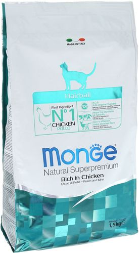 Сухой корм "Monge" - это полноценный корм для взрослых кошек (от 1 года до 10 лет), страдающих от комочков шерсти в желудке, разработан с добавлением растительной клетчатки, помогающей выводить эти комочки из организма. Более того, содержащийся L-карнитин предотвращает накопление жира, защищая печень и сердце, в то время как оптимальное соотношение жирных кислот Омега-3 и Омега-6 является эффективной помощью при воспалениях и предотвращает аллергию. Корм также содержит высокоусваиваемые злаки, помогает поддерживать остроту зрения и здоровое сердце, усиливает иммунную систему и правильное развитие скелета, зубов и суставов. Состав: курица (свежая 10%, дегидрированная 26%), кукуруза, животный жир (куриный жир 99,6%, консервированный при помощи натуральных антиоксидантов), рис, сухая свекольная пульпа, кукурузная, глютеновая мука, гидролизованный животный белок, яичный порошок (с высоким содержанием полноценного белка), рыба (дегидрированный лосось), рыбий жир (лососевый жир), пивные дрожжи (источник МОС и витамина В12), нерастворимые гороховые волокна, таурин, КОС (ксило-олигосахариды 3г/кг), гидролизованные дрожжи (МОС), юкка Шидигера, шиповник. Товар сертифицирован.