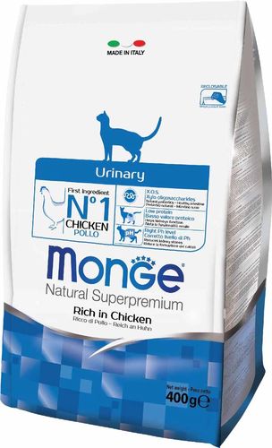 Корм сухой Monge "Urinary" - полноценный сбалансированный рацион для взрослых кошек для профилактики мочекаменной болезни, помогающий предотварить образование кристаллов и камней в мочевом пузыре. Оптимальный уровень Ph - уменьшает риск возникновения мочекаменной болезни. Сбалансированное содержание магния, кальция и фосфора способствует поддержанию нормального функционирования мочевыводящих путей, а высокое содержание белков животного происхождения обеспечивает слабо-кислый рН мочи, что в комплексе снижает риск развития мочекаменной болезни. Содержание X.O.S. помогает сохранить естественный баланс кишечной микрофлоры, способствует усвоению пищи и повышает иммунитет. Витамин С является мощным антиоксидантом, который способствует поддержанию имунной системы и естественной защиты организма. Гарантированный анализ: сырой белок 31,00%, сырые масла и жиры 16,00%, сырая клетчатка 2,50%, сырая зола 5,00%, кальций 0,80%, фосфор 0,80%, магний 0,06%, натрий 0,20%, омега-6 незаменимые жирные кислоты 8,50%, омега-3 жирные кислоты 1,00%. Пищевые добавки/кг: витамин А 27 000МЕ, витамин D3 1500 МЕ, витамин Е 510 мг, витамин B1 22 мг, витамин В2 23 мг, витамин В6 14 мг, витамин В12 0,20 мг, биотин 0,57 мг, никотиновая кислота 100 мг, витамин С 360 мг, пантотеновая кислота 22 мг, фолиевая кислота 31 мг, холина хлорид 2500 мг, Е5 сульфат марганца моногидрат 56 мг, Е6 оксид цинка 260 мг, Е4 сульфат меди пентагидрат 22 мг, Е1 сульфат железа моногидрат 185 мг, Е8 селенит натрия 0,37 мг, Е2 йодат кальция 2,80 мг. Аминокислоты/кг: L-карнитин 500 мг, DL-метионин 3,00г, таурин 0,25%. Антиоксиданты: натуральная смесь из токоферола и экстракта розмарина обыкновенного. Энергетическая ценность: 4100 ккал/кг.Ингредиенты: рис, кукурузная глютеновая мука, курица (дегидрированная 18%, свежая 5%), рыба (дегидрированный лосось), животный жир (куриный жир 99,6%, консервированный с помощью натуральных антиоксидантов), овес,гидролизированный животный белок, дегидрированныйгорох, яичный порошок (с высоким содержанием полноценного белка), рыбий жир (масло лосося) таурин, КОС (ксилоолигосахариды 3г/кг),гидрализованные дрожжи (МОС), юкка Шидигера. Рекомендации по кормлению: не ограничивайте количество корма. Кошка будет съедать столько корма, сколько необходимо для поддержания оптимального веса. При избыточном весе и/или наличии других проблем, рекомендуется ограничивать суточную норму корма в соответствии с рекомендациями ветеринарного врача и/или следовать приведенной на упаковке таблице. Важно, чтобы животное всегда имело доступ к чистой, свежей воде.