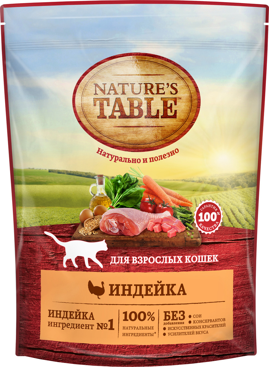 Натурально и полезно!Рацион Nature`s Table "Индейка" содержит 100% натуральные ингредиенты высокого качества, получаемые от проверенных поставщиков: - ингредиент №1 – индейка – источник животного белка с высокой усвояемостью, диетическое мясо; - подсолнечное масло и рыбий жир – для здоровья кожи и блестящей шерсти; - натуральные овощи и злаки – содержат легкоусвояемые углеводы, минералы и витамины группы В для здорового пищеварения, поддержания микрофлоры кишечника и высокого уровня активности вашей кошки; - БЕЗ сои, искусственных красителей, усилителей вкуса и консервантов. Nature`s Table – вся польза природы для вашей кошки, чтобы она радовала вас здоровьем и красотой день за днем! Полнорационный корм, предназначенный только для взрослых кошек. Рекомендации по ежедневному питанию: 1. Для кормления только сухим кормом: - масса кошки 3 кг – 45 г (170 ккал в сутки); - масса кошки 4 кг – 55 г (210 ккал в сутки); - масса кошки 5 кг – 60 г (245 ккал в сутки). 2. Для сочетания сухого и влажного рационов: - масса кошки 3 кг – 10 г сухого и 2 пакетика влажного корма по 85 г (170 ккал в сутки); - масса кошки 4 кг – 20 г и 2 пакетика влажного корма по 85 г (210 ккал в сутки); - масса кошки 5 кг – 25 г и 2 пакетика влажного корма по 85 г (245 ккал в сутки). Миска со свежей питьевой водой должна постоянно быть рядом с местом кормления.Состав: индейка, пшеница, кукуруза, рис, жиры и масла (животный жир, растительное масло, рыбий жир), бульон, соль, витамины и минералы, дрожжи, овощи и зелень (сухая мякоть сахарной свеклы, горошек, морковь, томаты, шпинат, цикорий), куриное яйцо. Не содержит сои, искусственных красителей, усилителей вкуса и консервантов.