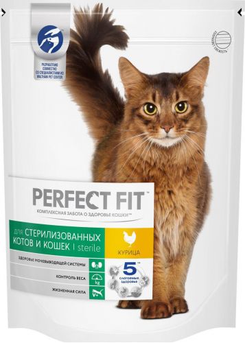 "Perfect Fit" – это специально разработанный корм, созданный для того, чтобы обеспечить вашу кошку всеми питательными веществами, необходимыми для долгой и здоровой жизни.У каждой кошки свой образ жизни. Кто-то часами может наблюдать за рыбками в аквариуме или просто дремать, а кто-то резвится и играет, как котенок весь день напролет. Чтобы привычный образ жизни оставался таким же беззаботным и после стерилизации, кошкам необходим рацион, учитывающий особенности организма после операции. Perfect Fit "Sterile" создан специально для поддержания здоровья и жизненного тонуса домашних кошек после кастрации или стерилизации.Состав: высушенный белок из птицы (включая 24% курицы), пшеница, высушенный животный белок, кукуруза, кукурузный белок, животный жир, рис, высушенная печень, сухая свекла, соль, дрожжи, хлорид калия, подсолнечное масло, рыбий жир.Биохимический состав: белки- 41%, жиры- 14,50%, клетчатка- 2%, зола- 8%, кальций- 1,1%, фосфор- 1%, магний- 0,10%, омега3- 0,5 г , Омега6- 3,6 г, биотин (B7)- 0,02г, таурин -187 мг, витамин А- 1681 МЕ, витамин Д3- 174,5 МЕ, витамин Е- 81 мг, витамин С- 37,5 мг, сульфат цинка- 14,5 мг, витамины группы B.Товар сертифицирован.Уважаемые покупатели!Обращаем ваше внимание на возможные изменения в дизайне упаковки. Качественные характеристики товара остались неизменными. Поставка осуществляется в зависимости от наличия на складе.
