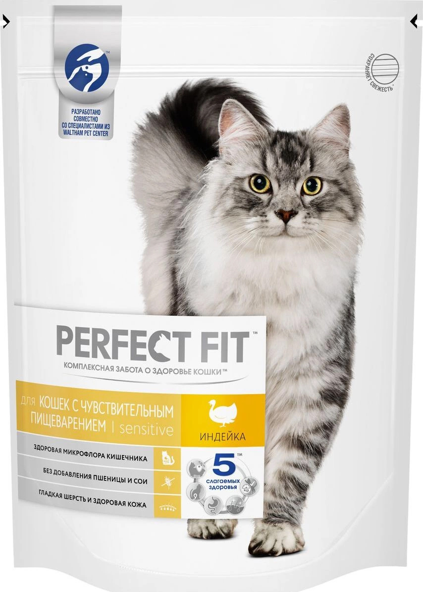 "Perfect Fit" - рацион, адаптированный специально для кошек с особенностями пищеварения. Он содержит пребиотики, способствующие поддержанию здоровой микрофлоры кишечника, и не содержит пшеницы и сои, которые могут вызвать дискомфорт в желудке кошки. Вашу кошку следует кормить кормом комнатной температуры. Товар сертифицирован.