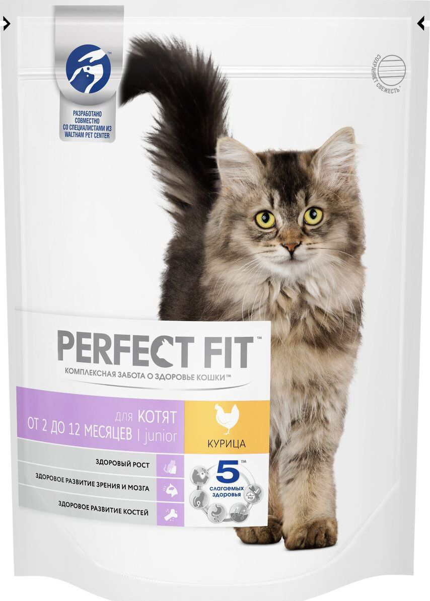 "Perfect Fit" – это специально разработанный корм, созданный для того, чтобы обеспечить вашу кошку всеми питательными веществами, необходимыми для долгой и здоровой жизни.Маленьким исследователям необходимо в 4 раза больше энергии, чем взрослым кошкам. Чтобы котенок рос здоровым и сильным, ему нужно правильное питание. Корм "Perfect Fit" специально разработан для котят с формулой "Junior". В нем содержится необходимое количество белков, минералов, а также комплекс антиоксидантов для сильного иммунитета. Для здоровья зубов и костей корм содержит кальций и фосфор. А легкоусвояемые белки и клетчатка обеспечат правильное пищеварение.Ингредиенты: дегидратированный белок птицы (курица не менее 24%), дегидратированный животный белок, животный жир, кукуруза, кукурузный глютен, кукурузная мука, рис, рисовый белок, соевая мука, сушеная свекла, дрожжи, мука из цветков календулы, витамины и минералы, соль.Гарантированный анализ: белок - 41%, жир - 14,5%, клетчатка - 2%, зола - 9%, влажность - 9%, кальций - 1,8%, фосфор - 1,6%, магний - 0,1%, цинк - 0,005%, медь - 0,001%, таурин - 0,2%, витамин А - 1500 МЕ, витамин D3 - 150 МЕ, витамин Е - 0,05%, витамин С - 0,02%.Товар сертифицирован.уважаемые покупатели!Обращаем ваше внимание на возможные изменения в дизайне упаковки. Качественные характеристики товара остались неизменными. Поставка осуществляется в зависимости от наличия на складе.