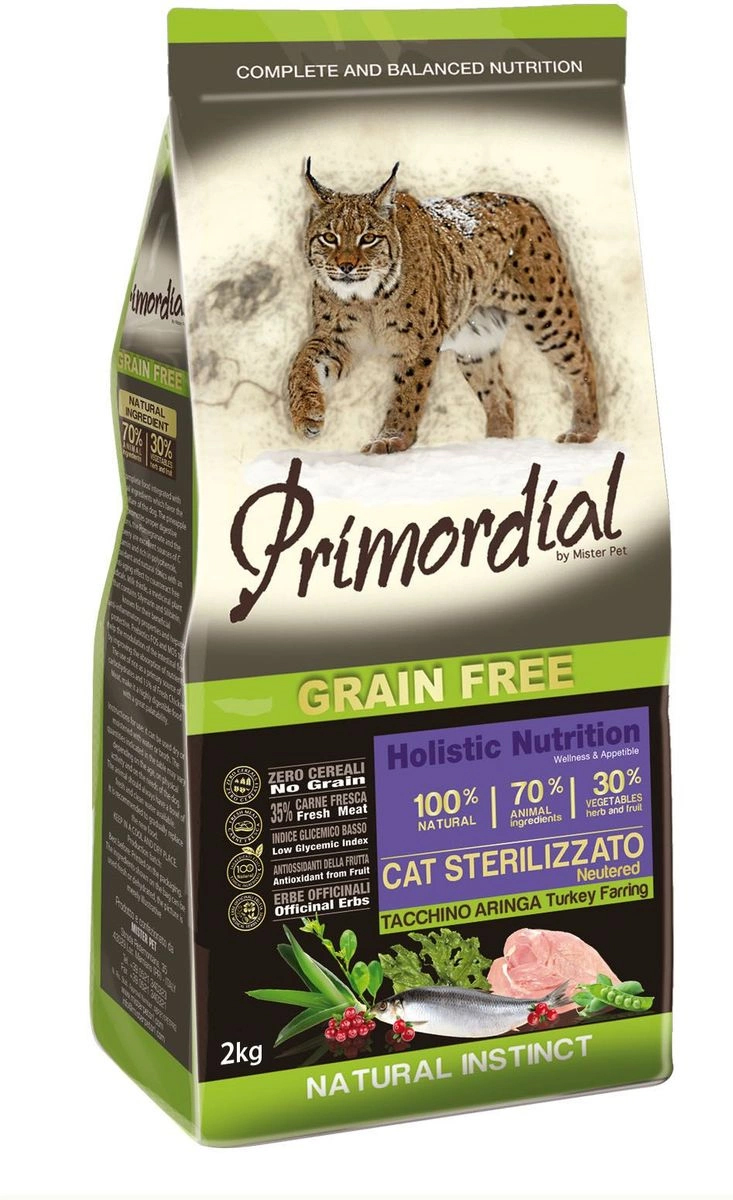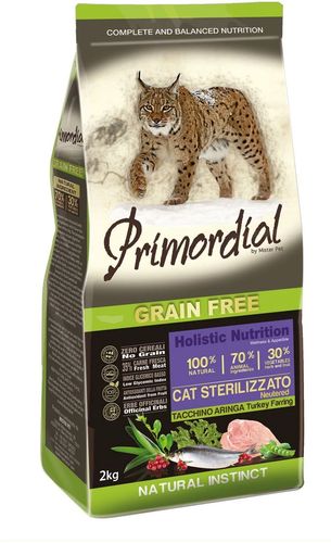 Беззерновой корм класса холистик "Primordial" создан для стерилизованных кошек. Специально отобранные виды мяса и рыбы поддерживают низкий гликемический индекс, гарантируют высокую аппетитность и перевариваемость корма. Состав: свежее мясо индейки (35%), дегидрированное куриное мясо (16%), горошек, картофель, мука из дегидрированной сельди (10%), индюшачий и куриный жир, сушеная мякоть свеклы, бобы кормовые, льняное семя (2%), гидролизат печени, дрожжи, мука из морских водорослей (0,24%), дрожжевые продукты (MOS 0,16%), юкка Шидигера (0,033%), концентрат леспедецы головчатой (Lespediza capitata Mich.) (0,028%), концентрат клюквы (Vaccinium macrocarpon Aiton.) (0,004%), экстракт розмарина. Пищевые добавки на кг: 3a672a Витамин A 21000 UI, Витамин D3 1400 UI, 3a700 Витамин E 180 мг, E4 пентагидрат сульфата меди 59 мг, E1 карбонат железа 62 мг, E5 оксид марганца 77 мг, E6 моногидрат сульфата цинка 186 мг, E2 йодистый калий 4,85 мг, E8 селенит натрия 0,35 мг, таурин 2000 мг. Аналитические компоненты: влага 8%, сырой белок 33%, сырые масла и жиры 14%, сырая зола 7,5%, сырая клетчатка 3%. Товар сертифицирован.