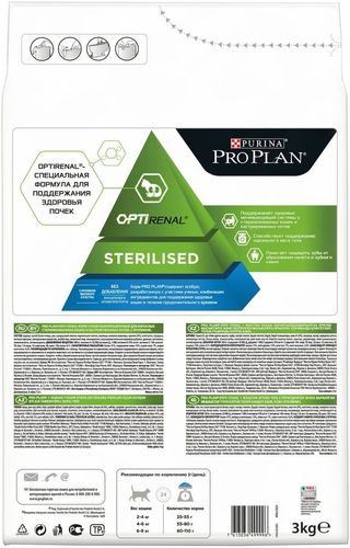 Сухой корм Pro Plan "Sterilised" - полнорационный корм для взрослых кастрированных котов и стерилизованных кошек. Содержит особую разработанную с участием ученых комбинацию ингредиентов для поддержания здоровья кошек в течение продолжительного времени. Pro Plan STERILISED - корм с высококачественным белком и низким содержанием жира, сочетающий все необходимые питательные вещества, включая витамины А, С и Е, а также Омега-3 и Омега-6 жирные кислоты. Обеспечивает баланс pH мочи. Для поддержания здоровья стерилизованных кошек и кастрированных котов. Содержит Optirenal, уникальный комплекс для поддержания здоровья почек. Поддерживает здоровье мочевыводящей системы стерилизованных кошек и кастрированных котов, предотвращая риск развития заболевания нижнего отдела мочевыводящих путей. Помогает защищать зубы от образования налета и зубного камня. Помогает поддерживать здоровый вес. Состав: курица, кукурузный глютен, рис, сухой белок птицы, кукуруза, концентрат горохового белка, пшеничный глютен, пшеничная клетчатка, кролик (4%), минеральные вещества, яичный порошок, животный жир, рыбий жир, вкусоароматическая кормовая добавка, дрожжи. Добавленные вещества (на 1 кг): витамин А 35000 МЕ; витамин D3 1100 МЕ; витамин Е 900 МЕ; витамин С 160 мг; железо 60 мг; йод 1,9 мг; медь 12 мг; марганец 15 мг; цинк 145 мг; селен 0,12 мг, антиокислители. Гарантируемые показатели: белок 41%, жир 12%, сырая зола 7%, сырая клетчатка 4,5%, Омега-3 жирные кислоты 0,75%, Омега-6 жирные кислоты 2%. Товар сертифицирован.