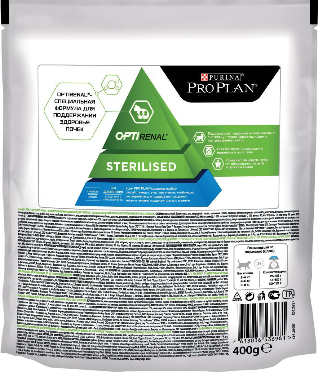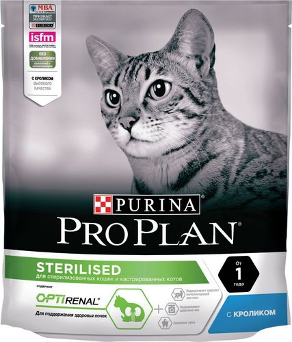 Корм Pro Plan "Sterilised" содержит особую, разработанную с участием ученых, комбинацию ингредиентов для поддержания здоровья кошек в течение продолжительного времени. Pro Plan для стерилизованных кошек и кастрированных котов - корм с высоким содержанием белка и низким содержанием жира, сочетающий все необходимые питательные вещества, включая витамины А, С и Е, а также Омега-3 и Омега-6 жирные кислоты. Обеспечивает pH баланс мочи. Состав: курица, сухой белок птицы, рис, кукурузный глютен, пшеничный глютен, пшеница, пшеничные волокна, кролик (4%), кукуруза, яичный порошок, минеральные вещества, рыбий жир, животный жир, консерванты, витамины, вкусоароматическая кормовая добавка, дрожжи, антиоксиданты. Дополнительные вещества: МЕ/кг: витамин A: 35 000; витамин D3: 1 100; витамин E: 900. Мг/кг: витамин C: 160; железо: 60; йод: 1,9; медь: 12; марганец: 15; цинк: 145; селен: 0,12. С антиокислителями. Белок: 41%, жир: 12%, сырая зола: 7%, сырая клетчатка: 4,5%, омега-3 жирные кислоты: 0,5%, омега-6 жирные кислоты: 2%.