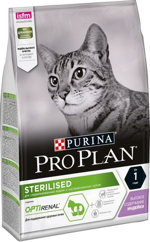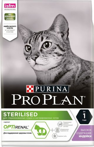 Сухой корм Pro Plan "Sterilised" - это полноценный рацион для взрослых стерилизованных кошек и кастрированных котов. Он содержит особую разработанную с участием ученых комбинацию ингредиентов для поддержания здоровья вашего питомца в течение продолжительного времени. Корм с высококачественным белком и низким содержанием жира, сочетающий все необходимые питательные вещества, включая витамины А, С и Е, а также Омега-3 и Омега-6 жирные кислоты. Обеспечивает баланс pH мочи. Особенности сухого корма: поддерживает здоровье мочевыводящей системы стерилизованных кошек и кастрированных котов, предотвращая риск развития заболевания нижнего отдела мочевыводящих путей, помогает защищать зубы от образования налета и зубного камня, помогает поддерживать здоровый вес, содержит уникальную формулу для поддержания здоровья почек. Состав: индейка (20%), кукурузный глютен, рис, сухой белок птицы, кукуруза, концентрат горохового белка, пшеничный глютен, пшеничная клетчатка, яичный порошок, минеральные вещества, животный жир, рыбий жир, вкусоароматическая кормовая добавка, дрожжи. Анализ: белок: 41%, жир: 12%, сырая зола: 7%, сырая клетчатка: 4,5%. Добавки на кг: витамин А: 35 000; витамин D3: 1100; витамин Е: 900 мг/кг; железо: 60; йод: 1,9; медь: 12; марганец: 15; цинк: 145; селен: 0,12 мг/кг. Товар сертифицирован.