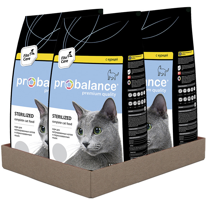 Полнорационный сбалансированный сухой корм премиум класса для кастрированных котов и стерилизованных кошек с курицей. Рекомендован для ежедневного кормления. В одной упаковке 3 пакета по 1,8 кг каждый.Полнорационный сбалансированный сухой корм премиум класса для кастрированных котов и стерилизованных кошек с курицей. Рекомендован для ежедневного кормления. Корм Probalance «Sterilized» разработан практикующими ветеринарами из Дании для кормления стерилизованных и кастрированных питомцев. Согласно проведенным исследованиям, такие питомцы становятся менее подвижными и, как следствие, могут набирать лишний вес. Баланс питательных веществ и калорий корма помогает поддерживать вес животного на оптимальном уровне, а L-карнитин способствует сжиганию лишних жиров в организме.Рацион Probalance «Sterilized» является профилактическим средством против мочекаменной болезни. Корм способствует стимуляции потребления воды животным, тем самым увеличивая объем мочи и снижая риск образования камней в мочевыводящих путях. Фито-композиция «Fitocare for cats» (запатентованный сбор из целебных трав) обладает общеукрепляющим и тонизирующим свойствами, стимулирует иммунитет и способствует долголетию Вашей кошки.Probalance – натуральный рацион на каждый день, баланс вкуса и пользы.Состав: Дегидратированное мясо птицы мин. 30% (в т.ч. из курицы мин. 23%), рис, ячмень, горох, куриный жир, натуральные вкусоароматические добавки, овес, рыбная мука, дрожжи (источник Омега-3 и Омега-6 жирных кислот), яичный порошок, жом свекловичный, масло подсолнечное, фито-композиция из целебных трав «Fitocare for cats», рыбий жир, витаминно-минеральная добавка для кошек (витамины А, D3, Е, В1, В2, В3, В4, В5, В6, В9 (фолиевая кислота), В12, Н (биотин), железо, медь, цинк, марганец, йод, селен), пребиотик, таурин (для здоровья сердца и зрения), лизин (укрепляет иммунитет), лецитин (для восстановления клеток), соль, экстракт Юкки Шидигера (снижает запах фекалий), L-карнитин (способствует сжиганию жиров в организме). Добавки, сохраняющие продукт: мико карб, натуральные антиоксиданты (смесь токоферолов).Энергетическая ценность: 363 ккал / 100 г.Гарантированные показатели: протеин - 32%, жир - 12%, клетчатка - 4%, зола – 5,5%, кальций - 1%, фосфор – 0,8%, влажность - 10%, витамин А - 5000 МЕ/кг, витамин D3 – 500 МЕ/кг, витамин Е – 45 мг/кг.