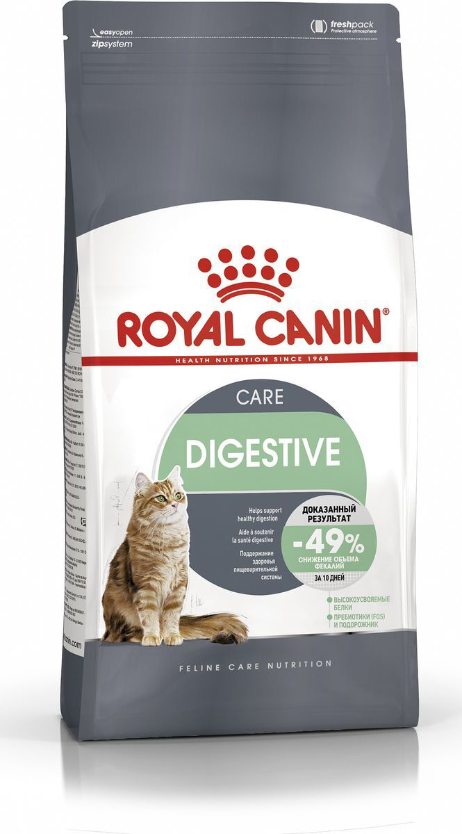 Сухой корм Royal Canin "Digestive Care" - это полнорационный сбалансированный корм для кошек с расстройствами пищеварительной системы. По своей природе кошки регулярно потребляют небольшое количество пищи в течение дня. Однако, некоторые из них способны съесть достаточно большую порцию за короткое время, что может привести к пищеварительному расстройству и срыгиванию. Специальные крокеты разработаны для того, чтобы стимулировать тщательное пережевывание корма и предотвратить его заглатывание, что предотвратит срыгивание пищи. Формула специально разработана для того, чтобы способствовать оптимальному усвоению продукта и облегчить процесс пищеварения. В дальнейшем это приведет к уменьшению объема фекалий. Уход за ЖКТ-это точно сбалансированная питательная формула, которая помогает поддерживать здоровье пищеварительной системы. С двойным действием: - Легко усваивается: пищеварительная формула содержит белки чрезвычайно высокой усвояемости (L.I.P). В его основе лежит смесь пребиотиков (ФОС: фрукто-олиго-сахаридов) и волокон (в том числе подорожника). Эти компоненты способствуют оптимальному усвоению продукта и регулируют транзит пищи по кишечнику кошки. - Благодаря уникальной текстуре и форме крокет кошка тщательнее разгрызает корм, а не заглатывает его целиком, что позволяет увеличить время приема пищи. Тщательное разжевывание помогает сократить риск срыгивания и подготавливает пищу к перевариванию. Доказанные результаты: Объем фекалий снижается на 49% через 10 дней при кормлении исключительно продуктом DIGESTIVE CARE, благодаря улучшению пищеварения и усвоения питательных веществ. Содержит баланс минералов для поддержания здоровья мочевыводящих путей взрослой кошки. Состав: изолят растительного белка, пшеничная мука, рис, обезвоженная рыба, животные жиры, дегидратированный белок мяса птицы, гидролизат белков животного происхождения, кукурузный глютен, кукурузная мука, растительные волокна, мякоть цикория, минеральные вещества, соевое масло, рыбий жир, фрукто-олиго-сахариды (0.3%), подорожника шелухи и семян (0.2%). Добавки (на 1 кг): витамин А: 17000МЕ,Витамин D3: 900МЕ, Е1 (железо): 41мг, Е2 (йод): 4.1мг, Е4 (медь): 12мг, е5 (Марганец): 53мг, Е6 (цинк): 159мг - технологические добавки: Клиноптилолитосадочного происхождения: 10г - консерванты - антиоксиданты. Товар сертифицирован.