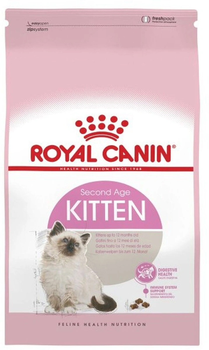 Royal Canin Feline Health Nutrition Second Age Kitten — это полноценный и сбалансированный корм для котят с момента отъема и до 12 месяцев.Здоровье пищеварительной системы. В течение периода роста пищеварительная система котенка остается несовершенной и продолжает постепенно развиваться в течение еще нескольких недель. Уникальная комбинация питательных веществ помогает поддерживать здоровое пищеварение котенка и нормализует стул. Легкоусвояемые белки (L.I.P.*), адаптированное содержание клетчатки (в том числе подорожника и пребиотиков) способствует балансу кишечной микрофлоры.Естественная защита. Комплекс антиоксидантов и пребиотики, содержащиеся в рационе, поддерживают естественные защитные силы котенка.Гармоничный рост. Сбалансированное содержание легкоусвояемых белков (L.I.P.*), витаминов и минеральных веществ в рационе способствует росту котенка, а также удовлетворяет его энергетические потребности в период интенсивного роста. * L.I.P. — белки, отобранные по принципу максимальной усвояемости.