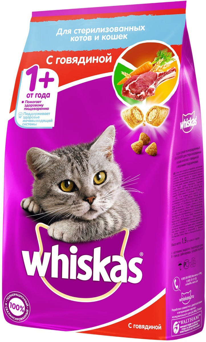 Сухой корм "Whiskas" создан специально, учитывая особые потребности питомца. Хрустящие подушечки с нежным паштетом внутри обязательно придутся по вкусу вашей кошке. Кроме того, "Whiskas" содержит все необходимое, чтобы еда вашей стерилизованной любимицы была не только вкусной, но и полезной. "Whiskas" это:- Оптимальное сочетание питательных веществ и нутриентов для подержания обмена веществ и здоровья мочевыводящей системы;- Витамин Е и цинк для иммунитета;- Омега-6 и цинк для здоровья кожи и шерсти;- Баланс кальция и фосфора для здоровья костей;- Витамин А и таурин для хорошего зрения;- Высокоусваиваемые ингредиенты и клетчатка для пищеварения;- Сухая текстура корма для удаления зубного налета.Рекомендуется сочетать разные форматы корма в рационе питомца. Утром и вечером нужно давать влажный рацион, а в течение дня - сухой. Это позволит объединить преимущества каждого из форматов, ведь рацион должен быть не только вкусным, но и полезным. Нужно помнить, что смешивать в одной миске сухой и влажный рационы не рекомендуется. Кроме того, у питомца всегда должен быть доступ к чистой питьевой воде. "Whiskas" для стерилизованных кошек и котов - это сбалансированный рацион, который содержит специальный минеральный комплекс, необходимый для здоровья мочевыводящей системы вашей любимицы. Состав: злаки и продукты их переработки, растительные белковые экстракты, мука животного происхождения (в том числе из говядины), животные жиры и растительные масла (в том числе подсолнечное масло), гидролизат из продуктов животного происхождения, минеральные вещества, витамины, свекловичный жом, пивные дрожжи, красители, аминокислоты (в том числе таурин), морковь сушеная, антиоксиданты. Содержание питательных веществ (100 г): белок – 30 г; жир – 10,5 г; Витамин А - 600 МЕ, витамин D3 - 45 МЕ, витамин Е - 7,1 мг. Энергетическая ценность (100 г): 360 ккал / 1506 кДж.Хранить при температуре от +4 до +35°С и относительной влажности воздуха не более 75%. Вскрытую упаковку хранить не более 4 недель.Товар сертифицирован.