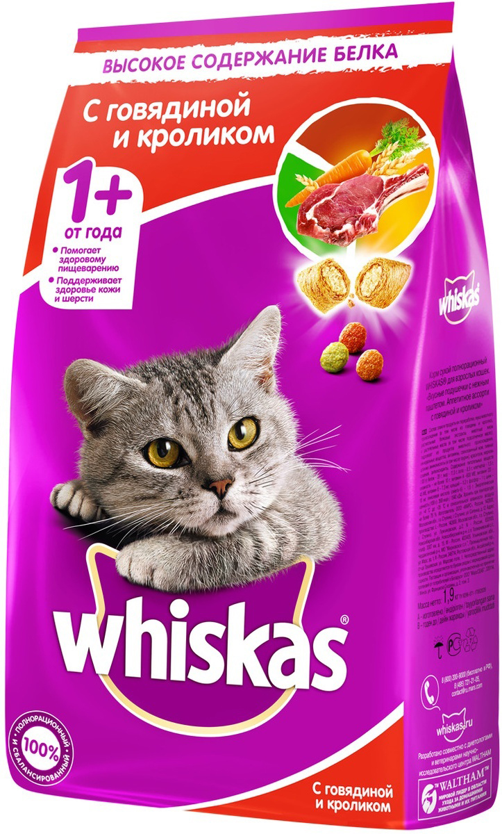 Это сбалансированный рацион для здоровой и счастливой жизни Вашей кошки. Хрустящие подушечки с нежным паштетом внутри обязательно придутся по вкусу Вашей любимице. Кроме того, Whiskas содержит все необходимое, чтобы еда Вашей кошки была не только вкусной, но и полезной. Whiskas это: • Оптимальное сочетание питательных веществ и нутриентов для подержания обмена веществ • Витамин Е и цинк для иммунитета • Омега-6 и цинк для здоровья кожи и шерсти • Баланс кальция и фосфора для здоровья костей • Витамин А и таурин для хорошего зрения • Высокоусваиваемые ингредиенты и клетчатка для пищеварения • Сухая текстура корма для удаления зубного налетаWhiskas рекомендует сочетать разные форматы корма в рационе Вашей кошки. Утром и вечером Вашей любимице нужно давать влажный рацион, а в течение дня — сухой. Это позволит объединить преимущества каждого из форматов, ведь ее рацион должен быть не только вкусным, но и полезным. Нужно помнить, что смешивать в одной миске сухой и влажный рационы не рекомендуется. Кроме того, у вашей любимицы всегда должен быть доступ к чистой питьевой воде. Рационы Whiskas содержат все необходимые витамины и минералы, белки, жиры и углеводы, чтобы поддержать здоровье Вашей кошки от усов до кончика хвоста.Состав: злаки и продукты их переработки, мука животного происхождения (в том числе из говядины и кролика), растительные белковые экстракты, животные жиры и растительные масла (в том числе подсолнечное масло), гидролизат из продуктов животного происхождения, минеральные вещества, витамины, свекловичный жом, пивные дрожжи, аминокислоты (в том числе таурин), морковь сушеная, антиоксиданты.Содержание питательных веществ (100 г): белки – 35 г; жиры – 11.5 г; Витамин А - 600 МЕ, витамин D3 - 45 МЕ, витамин Е - 7,3 мг. Энергетическая ценность (100 г): 368 ккал / 1540 кДж.Хранить при температуре от +4 до +35°С и относительной влажности воздуха не более 75%. Вскрытую упаковку хранить не более 4 недель.