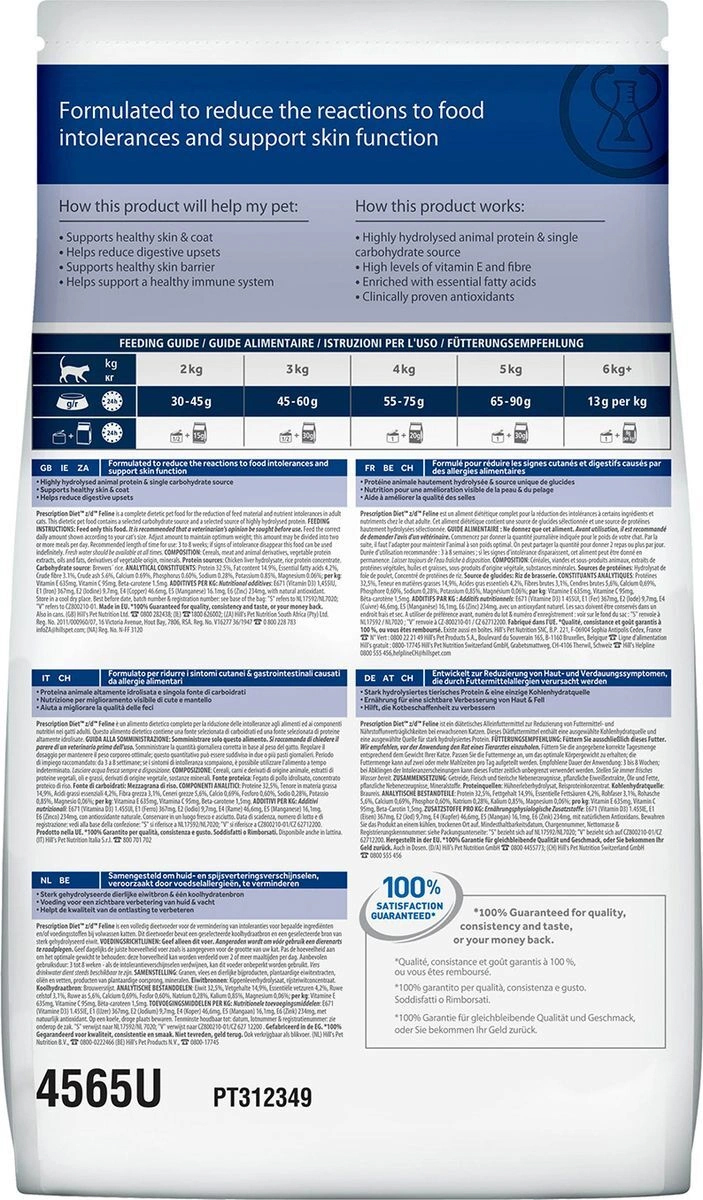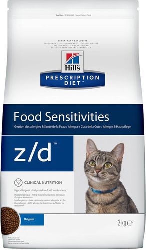 корм Hill’s Prescription Diet Feline z/d создан для решения проблем, связанных с пищевой аллергией у кошек. - Гипоаллергенный - за счет гидролизованного протеина животного происхождения и единственного источника углеводов. - Питание способствует видимому улучшению состояния кожи и шерсти. - Помогает улучшить качество стула. - Превосходный вкус, который понравится Вашей кошке.Протеин животного происхождения в составе корма Hill's z/d Cat подвергнуты гидролизу значительнои? степени, благодаря чему риск его обнаружения иммуннои? системои? сведен к минимуму. Концентрат рисового протеина является единственным источником протеина растительного происхождения, а рис - единственным источником углеводов. Источником жиров является растительное масло, очищенное и не содержащее протеинов. Hill's Prescription Diet z/d Cat выпускается только в виде консервов, поэтому его можно смешивать с сухим кормом Hill's. Prescription Diet z/d low Allergen Cat (если у кошки нет аллергии на рис).Назначение: При неблагоприятных реакциях на пищу и ее компоненты (пищевая аллергия или непереносимость).В качестве элиминационной диеты для исключения неблагоприятнои? реакции на пищу и ее компоненты в случае:Хронического зуда.Наружного отита.Желудочно-кишечных расстрои?ств, таких как воспалительные заболевания кишечника (в том числе колит) Не рекомендуется: - Котятам. - Беременным и кормящим кошкам.Длительность курса: Рекомендуемая продолжительность диетотерапии: 3-8 недель; если признаки пищевой непереносимости исчезли - пожизненноПеревод на данный корм: Пробуете этот корм впервые? Постепенно в течение 7 дней переводите животное на новый корм, увеличивая его содержание по отношению к прежнему. Обеспечьте питомцу свободный доступ к свежей воде. Рекомендация по кормлению: Монодиета. Не требует дополнений. Перед началом применения проконсультируйтесь с ветеринарным специалистом. Суточная норма кормления указана наупаковке и должна быть рассчитана в соответствии с размером кошки, чтобы поддерживать оптимальный вес; суточную норму можно разделить на 2 и более кормлений в день.Калорийность: Ккал/100г: 368