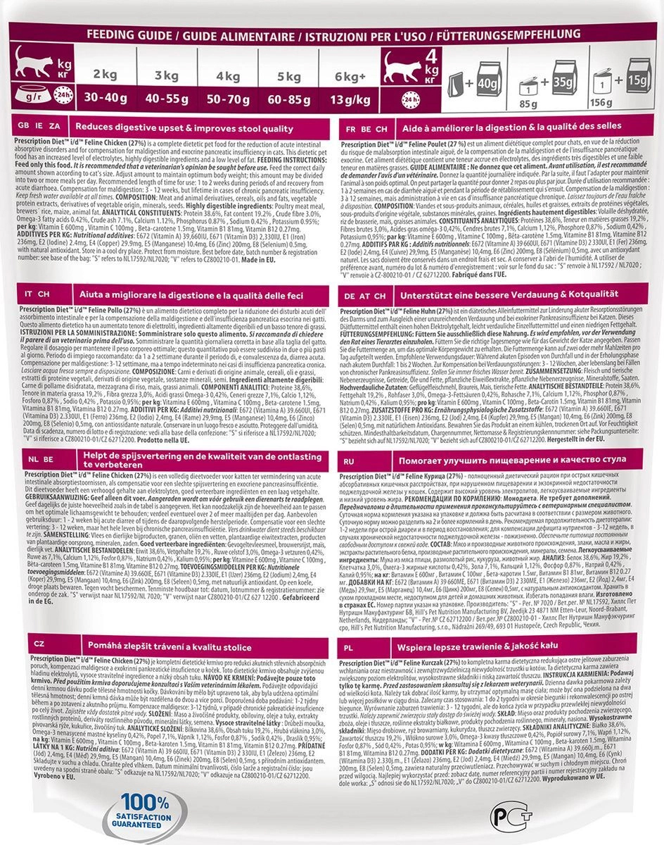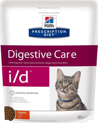 Hill’s Prescription Diet Feline i/d — высоко усваиваемый рацион, созданный специально для поддержания здоровья кошек с расстройствами пищеварения.Ключевые преимущества:- Помогает нейтрализовать действие свободных радикалов за счет высокого содержания антиоксидантов.- Обеспечивает великолепный вкус и возможность использования сухого и консервированного рационов для смешанного питания.Без искусственных ароматизаторов, красителей и консервантовНазначение:- При заболеваниях желудочно-кишечного тракта: гастрите, энтерите, колите (т.е. наиболее распространенные причины диареи).- Для восстановления после хирургическои ?операции на желудочно-кишечном тракте.- При недостаточности экзокриннои? функции поджелудочнои? железы.- При панкреатите без гиперлипидемии.- Для восстановления после легких хирургических процедур и состоянии?, незначительно ослабляющих организм.- Для котят в качестве повседневного питания.Рекомендации по кормлению: Монодиета. Не требует дополнений. Перед началом и о длительности применения проконсультируйтесь с ветеринарным специалистом. Суточная норма кормления указана на упаковке и должна быть рассчитана в соответствии с размером животного. Суточную норму можно разделить на 2 и более кормлений в день.Перевод на данный рацион: Пробуете этот рацион впервые? Постепенно в течение 7 дней переводите животное на новый рацион, увеличивая его содержание по отношению к прежнему. Обеспечьте питомца свободным доступом к свежей воде.Не рекомендуется:- Кошкам с задержкои? натрия в организме.- Обеспечивает полноценное сбалансированное питание котятам (в течение короткого периода) и взрослым кошкам.Содержание мяса: Курица 37%Ингредиенты: мясо и производные животного происхождения, злаки, масла и жиры, экстракты растительного белка, производные растительного происхождения, минералы, семена.Питательные вещества: белок 38,6%, Жир 19,2% , Клетчатка 3,0%, Омега-3 жирные кислоты 0,42%, Зола 7,1%, Кальций 1,12%, Фосфор 0,87% , Натрий 0,42% , Калий 0,95%; на кг: Витамин E 600мг, Витамин С 100мг , Бета-каротин 1,5мг, Витамин B1 81мг, Витамин B12 0,27мг.Добавки на кг: E672 (Витамин A) 39660МЕ, E671 (Витамин D3) 2330МЕ, E1 (Железо) 236мг, E2 (Йод) 2,4мг, E4 (Медь) 29,9мг, E5 (Марганец) 10,4мг, E6 (Цинк) 200мг, E8 (Селен) 0,5мг, с натуральным антиоксидантом.Калорийность (в рационе): Ккал/100г: 400Страна изготовления: ECУсловия хранения: Избегать попадания влаги. Хранить в сухом, прохладном месте, недоступном для детей и домашних животных.Вид упаковки: П/э пакетДругие рекомендуемые рационы:- При неблагоприятнои? реакции на пищу и ее компоненты: Hill’s Prescription Diet z/d Feline.- При заболеваниях желудочно-кишечного тракта, поддающихся коррекции с помощью клетчатки: Hill’s Prescription Diet w/d Feline.
