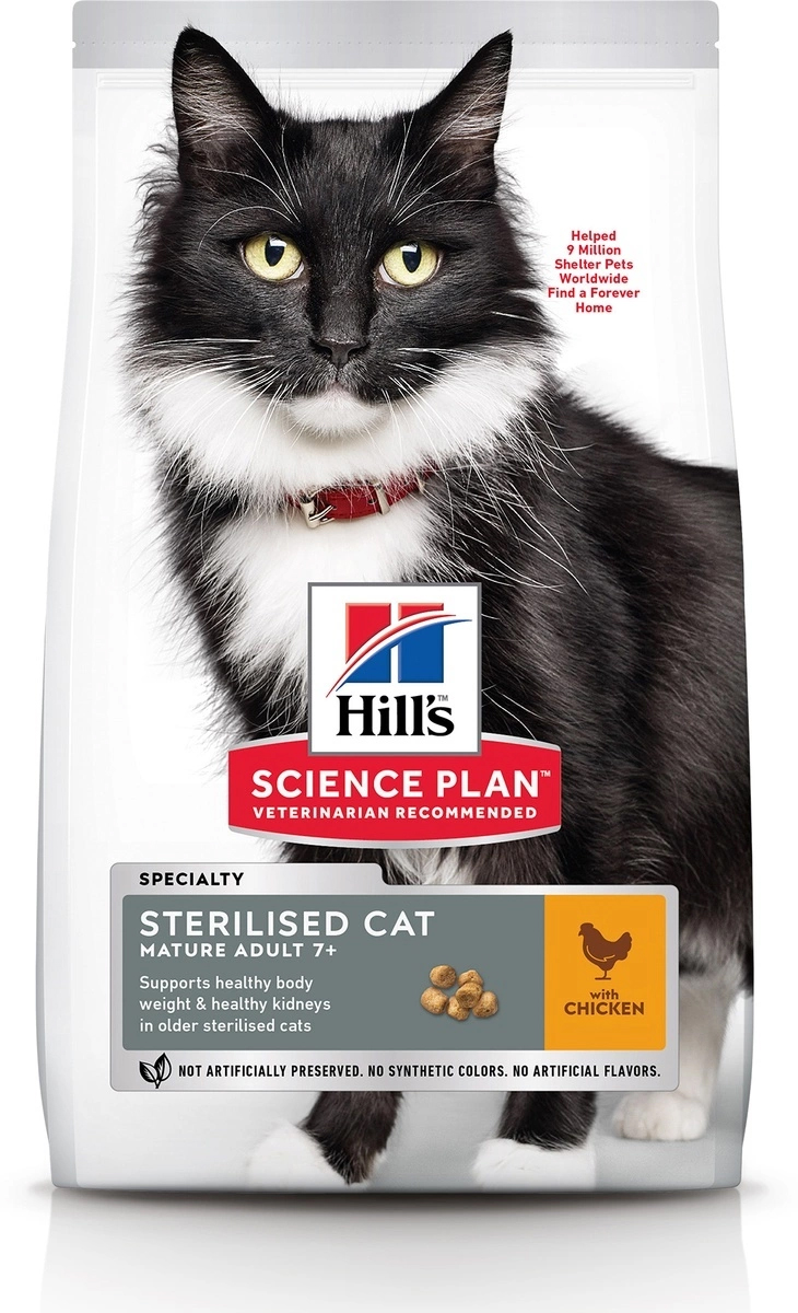 Сухой корм Hill's Sience Plan для взрослых стерилизованных кошек старше 7 лет, с курицей, 1,5 кгСтерилизованные кошки или кастрированные коты, склонны к набору избыточного веса, поскольку у них увеличивается аппетит и снижается активность. Также у них увеличивается вероятность возникновения проблем с функциями почек и мочевого пузыря. Сухой корм для пожилых стерилизованных кошек и кастрированных котов, с курицей Hill's Science Plan Sterilised Cat содержит уникальную формулу контроля веса, поддерживающую идеальный вес, а также сбалансированный набор минералов для поддержания здоровья функций почек и мочевого пузыря. - Сухой корм для пожилых стерилизованных кошек и кастрированных котов - Уникальная формула контроля веса с L-карнитином, поддерживает энергетические потребности кошек и котов и помогает сохранить идеальный вес - Сбалансированный набор минералов для поддержания функций мочевого пузыря и почек. - Низкий уровень жира и высокое содержание L-лизина для поддержания жизненной энергии - Натуральные легко усваиваемые ингредиенты высокого качестваПоддерживает здоровый вес и здоровье почек у пожилых стерилизованных кошек.Назначение:Взрослым стерилизованным кошкам старше 7 лет.Не рекомендуется: Для котят и беременных или кормящих кошек. Во время беременности или кормления нужно сменить корм на Hill's Science Plan Healthy Development для котят (влажный или сухой корм).Перевод на данный корм:Скорректируйте количество корма в соответствии с размером вашего питомца для поддержания оптимального веса. Если вы сомневайтесь, проконсультируйтесь с вашим ветеринарным врачом. Пробуете этот рацион впервые? В течение 7 дней постепенно увеличивайте содержание нового корма по отношению к прежнему до момента его полного замещения.Обеспечьте питомцу постоянный доступ к свежей воде.Пищевые потребности вашего питомца могут меняться с возрастом. Уточняйте у вашего ветеринарного специалиста подходит ли текущий рацион вашему питомцу на каждом осмотре. Содержание мяса: Курица 14%, общее содержание мяса домашней птицы 21%Состав на упаковке:Кукуруза, размолотый рис, мука из курицы и индейки, мука из кукурузного глютена, минералы, гидролизат белка, рыбий жир, животный жир, растительное масло.Питательные вещества:Белок 31,5%, Жир 9,3%, Клетчатка 0,90%, Зола 5,6%, L-лизин 2,1%, Кальций 0,86%, Фосфор 0,63%, Натрий 0,32%, Калий 0,81%, Магний 0,07%; на кг: Витамин А 6 022МЕ, Витамин D3 596МЕ, Витамин E 550мг, Витамин С 90мг, Бета-каротин 1,5мг, L-Карнитин 525мг.Добавки на кг:3b103 (Железо) 45,4мг, 3b202 (йод) 0,7мг, 3b405 (медь) 4,5мг, 3b502 (Марганец) 4,7мг, 3b603 (цинк) 93,9мг, E8 (Селен) 0,1мг; с натуральным антиоксидантом.Без искусственных ароматизаторов, красителей и консервантов.Калорийность: Ккал/100 г: 374Срок годности: 18 месяцевТип упаковки: П/Э пакетУсловия хранения: Избегать попадания влаги. Хранить в сухом, прохладном месте, недоступном для детей и домашних животных.Дизайн упаковки может быть изменен производителем!