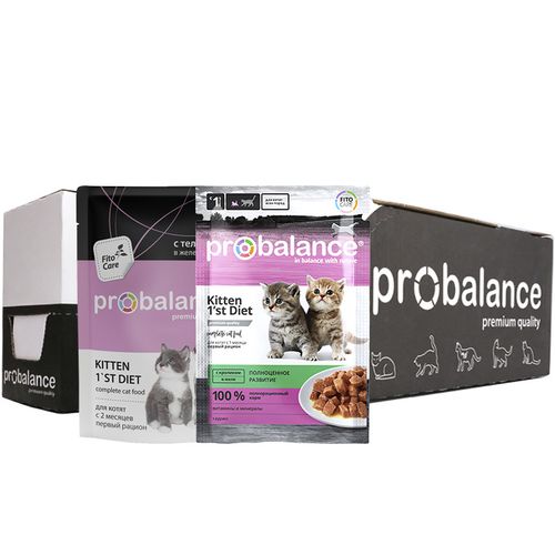Полнорационный сбалансированный консервированный корм премиум класса. Рекомендован для ежедневного кормления котят с 1-го месяца, а также беременных и кормящих кошек. В наборе 2 упаковки корма: в каждой коробке 25 пакетиков (паучей) по 85 г каждый. 25 шт. с кроликом в желе и 25 шт. телятиной в желе.Корм Probalance разработан практикуюшими датским ветеринарами. В основе консервированного корма Probalance «Kitten 1`st diet» – натуральные мясные ингредиенты. Они богаты витаминами, минералами и микроэлементами, что необходимо для полноценного развития и роста котенка. Природные антиоксиданты, содержащиеся в кусочках мяса, способствуют укреплению иммунитета.Фито-композиция «Fitocare for cats» (запатентованный сбор из целебных трав) обладает общеукрепляющим и тонизирующим свойствами.Корма Probalance - это баланс вкуса и пользы. Консервированные корма Probalance не содержат ГМО, красителей и Е-консервантов. В состав входит таурин – незаменимая аминокислота для организма кошек.Консистенция корма: мягкие мясные кусочки розово-бежевого цвета в желе. Запах не резкий, напоминает вареное мясо, без химических отдушек. Обоняние котят отличается от обоняния человека, поэтому корм пахнет иначе, чем еда со стола человека.Состав корма Probalance Kitten 1'st Diet c кроликом: Фарш куриный и куриные субпродукты, мясо и мясные субпродукты, рыба и рыбные субпродукты, растительные компоненты, фарш кролика (мин. 4 %), протеины животного происхождения, витаминно–минеральная добавка, фито-композиция «Fitocare».Состав корма Probalance Kitten 1'st Diet c телятиной: Мясо и мясные субпродукты (в т.ч. телятина не менее 4 %), фарш куриный, протеины растительного происхождения (злаки, горох), фито-композиция из целебных трав «Fitocare for cats», протеины животного происхождения, витаминно-минеральная добавка для котят, таурин, глюкозамин, хондроитин. Содержит таурин. Не содержит ГМО.Энергетическая ценность: 84 ккал / 100 г. Гарантированные показатели: протеин – 8%, жир – 5%, зола – 2,5%, клетчатка – 0,5%, влажность – 81%, кальций – 0,19%, фосфор – 0,15%, таурин – 0,04%, витамин А – 190 МЕ, витамин D – 19 МЕ, витамин Е – 1,5 МЕ, Fe - 1,9 мг, Mn - 0,19 мг, Cu - 0,095 мг.