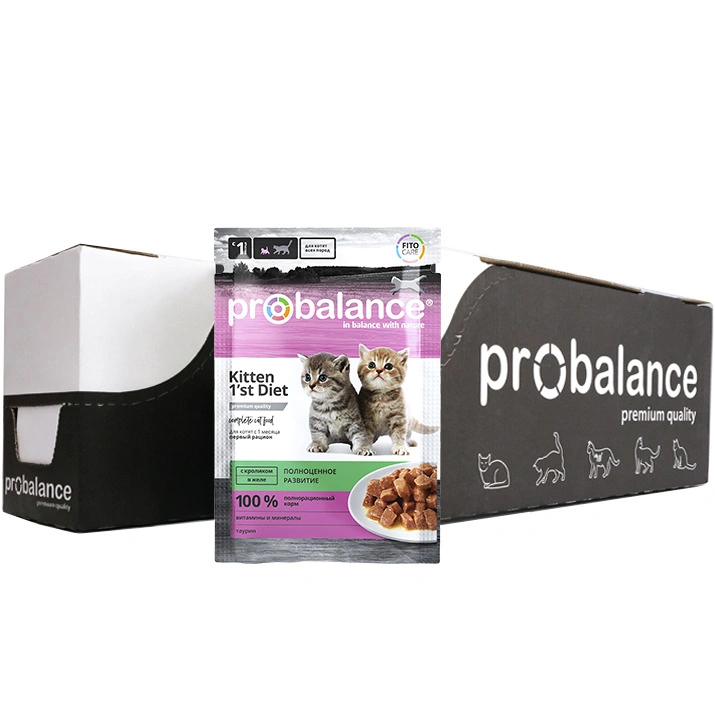 Полнорационный сбалансированный консервированный корм премиум класса с кроликом в желе. Корм рекомендован для ежедневного кормления котят с 1-го месяца, а также беременных и кормящих кошек.В наборе 2 упаковки корма. В каждой упаковке 25 пакетиков (паучей) по 85 г каждый.Влажный корм Probalance Kitten 1st diet разработан практикующими датскими ветеринарами. В состав корма входит натуральное мясо кролика – гипоаллергенный продукт, богатый витаминами, минералами и микроэлементами. Это необходимо для полноценного развития и роста котенка. Природные антиоксиданты, содержащиеся в кусочках мяса, способствуют укреплению иммунитета. Для остроты зрения и работы сердца в рецептуру корма включен таурин. Эту аминокислоту называют незаменимой, так как она самостоятельно не вырабатывается в организме котят и должна поступать из пищи.Фито-композиция «Fitocare for cats» – запатентованный сбор из целебных трав, который обладает общеукрепляющими и тонизирующими свойствами.Рационы Probalance не содержат искусственных Е-консервантов, усилителей вкуса и красителей. Probalance – это баланс вкуса и пользы, здоровое питание на каждый день.Консистенция корма: мягкие мясные кусочки розово-бежевого цвета в желе. Запах не резкий, напоминает вареное мясо, без химических отдушек. Обоняние котят отличается от обоняния человека, поэтому корм пахнет иначе, чем привычная для людей еда со стола.Состав: Фарш куриный и куриные субпродукты, мясо и мясные субпродукты, рыба и рыбные субпродукты, растительные компоненты, фарш кролика (мин. 4 %), протеины животного происхождения, витаминно–минеральная добавка, фито-композиция «Fitocare®». Содержит таурин. Не содержит ГМО. Энергетическая ценность: 84 ккал / 100 г. Гарантированные показатели: протеин – 8%, жир – 5%, зола – 2,5%, клетчатка – 0,5%, влажность – 81%, кальций – 0,19%, фосфор – 0,15%, таурин – 0,04%, витамин А – 190 МЕ, витамин D – 19 МЕ, витамин Е – 1,5 МЕ, Fe - 1,9 мг, Mn - 0,19 мг, Cu - 0,095 мг.