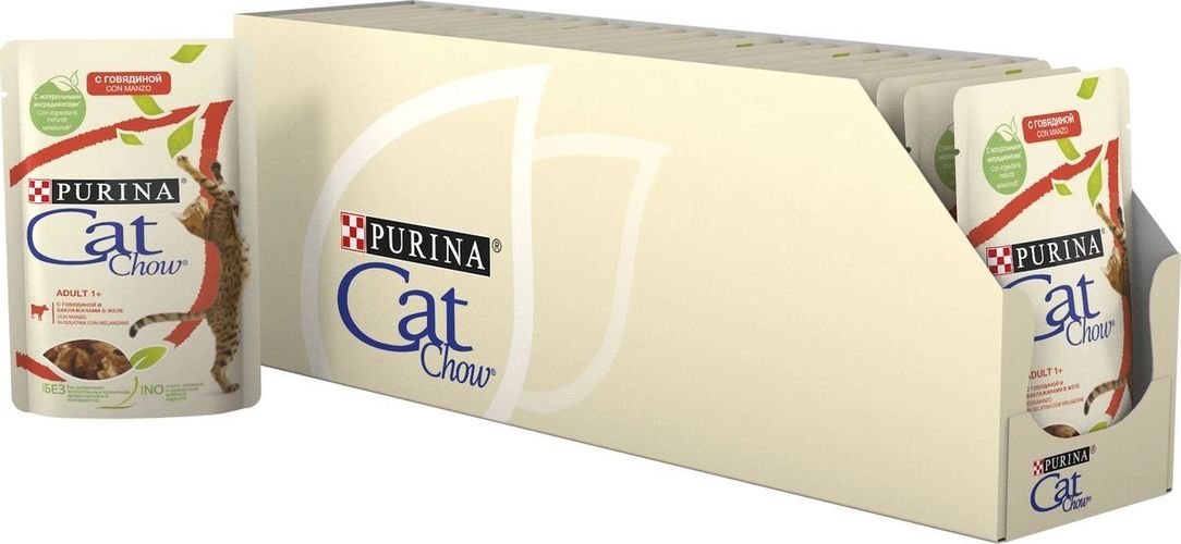 Состав: Мясо и продукты переработки мяса (из которых говядина мин.4%), экстракт растительного белка, рыба и продукты переработки рыбы, минеральные вещества, аминокислоты, загустители, овощи (в том числе 0,8 % сухого баклажана, эквивалентно 7% баклажана), сахара, дрожжи,витамины. Натуральные ингредиенты. Минеральные вещества: Витамин A: 580;витамин Д3: 89;витамин E:13;