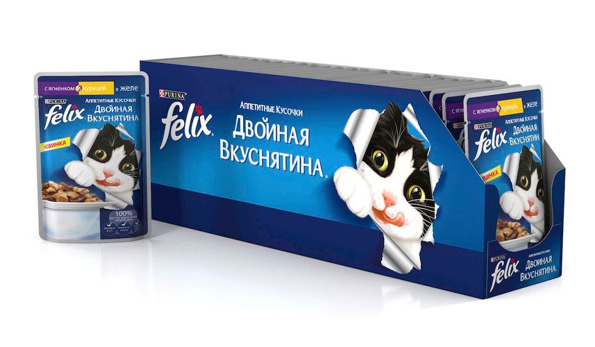 Felix "Аппетитные кусочки" - это совершенно особенный корм для кошек. У него такой аппетитный вид и аромат, словно его приготовили вы сами. Felix "Аппетитные кусочки" создан по специально разработанной рецептуре: это нежнейшие кусочки с мясом или рыбой, покрытые сочным желе. Ваш кот будет готов есть такую вкуснятину хоть каждый день - на завтрак, обед и ужин. Рекомендации по кормлению: Для взрослой кошки среднего веса (4кг) требуется примерно 3 пакетика в день. Кормление желательно разделить на два приема. Для беременных или кормящих кошек кормление без ограничений. Подавать корм при комнатной температуре. Следите, чтобы у вашей кошки всегда была чистая, свежая питьевая вода. Условия хранения: Закрытую упаковку хранить при температуре от +4°C до +35°C и относительной влажности воздуха не более 75%. После открытия продукт хранить в холодильнике максимум 24 часа. Состав: мясо и продукты его переработки (говядина мин.4%), экстракт растительного белка, рыба и продукты ее переработки, минеральные вещества, сахара, витамины. Добавленные вещества: МЕ/кг: Витамин А 1490, витамин D3 230; мг/кг железо 10, йод 0,3, медь 0,9, марганец 2,0, цинк 10. Гарантируемые показатели: влажность 80,0%, белок 13,0%, сырой жир 3,0%, сырая зола 2,2%, сырая клетчатка 0,5%. Энергетическая ценность (100г): 75,6 ккал. Товар сертифицирован.