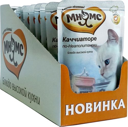 Мнямс паучи для кошек Каччиаторе по-Неаполитански (курица с томатами). В переводе с итальянского Каччиаторе означает «охотник». Считается, что возвращаясь домой из леса, охотники вместе с добычей приносили грибы, ароматные дикие травы и все, что находили по дороге. Именно поэтому состав ингредиентов зачастую зависел от времени года и местности. Сегодня блюдо Каччиаторе готовят из курицы, для чего тушат ее в смеси сладкого перца, лука, чеснока, грибов и трав с обязательным добавлением густого томатного соуса. Нежные кусочки курицы, впитавшие в себя запах чеснока и специй, сладость спелых помидоров, созревших под жарким солнцем Италии, никого не оставят равнодушным. Форма выпуска: пауч 85 г.Анализ компонентов: Белок - 10,6%, Жир - 6,3%, Клетчатка - 0,4%, Зола - 2,4%, Влажность - 80%Состав: мясо и субпродукты (из них курица 67%), томаты (3%), минералы, таурин (1500 мг), витамин D3 (200 ME), витамин Е (30 мг), цинк (15 мг), марганец (3 мг), йод (0,75 мг), селен (0,03 мг)."Норма кормления по весу взрослого животного: при кормлении необходимо учитывать возраст и активность животного. Кошка всегда должна иметь доступ к свежей питьевой воде."