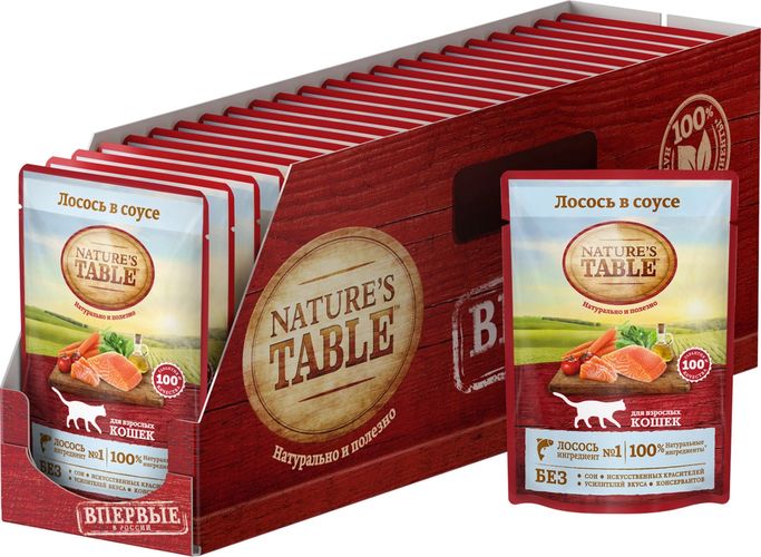 Рацион Nature's Table Лосось в соусе содержит на 100% натуральные ингредиенты самого высокого качества: Ингредиент № 1 - лосось - богатый источник белка и жирных кислот омега-3, является основой здорового рациона кошки; - Подсолнечное масло и рыбий жир - источники омега-3 и омега-6 кислот, витаминов А, D, E для естественного здоровья кожи и блестящей шерсти; - Натуральные овощи и злаки - источник углеводов и клетчатки, витаминов и минералов для здорового пищеварения, улучшения микрофлоры кишечника. Nature's Table - вся польза природы для вашей кошки, чтобы она радовала вас здоровьем и красотой день за днем! Состав: лосось, говядина, курица, масла и жиры, злаки, витамины и минеральные вещества, овощи (сухая мякоть сахарной свеклы, морковь, томаты, шпинат). Наличие нескольких видов протеинов (лосось, говядина, курица) обеспечивает сбалансированную формулу рациона. Не содержит сои, искусственных красителей, усилителей вкуса и консервантов.