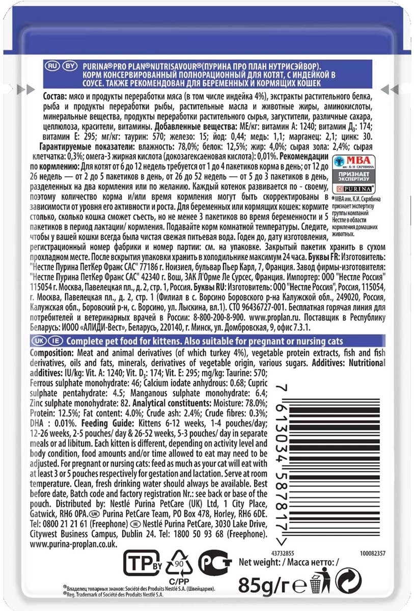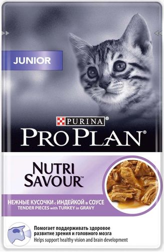 Влажный корм Pro Plan Nutri Savour для котят в возрасте от 6 недель до 1 года с индейкой в соусе, специально разработанные нежные кусочки в соусе для котят, которые легко жевать. Благодаря содержанию ПНЖК (полиненасыщенные жирные кислоты) поддерживает полноценное развитие органов зрения и мозга котенка. Рецептура корма обеспечивает сбалансированное питание благодаря содержанию всех необходимых питательных веществ для здорового развития растущих котят. Высокое содержание белка и оптимальный состав минеральных веществ способствуют здоровому развитию костей и мышечной массы котенка.Для котят от 6 до 12 недель требуется от 1 до 4 пакетиков корма в день; от 12 до 26 недель — от 2 до 5 пакетиков в день; от 26 до 52 недель — от 3 до 5 пакетиков в день, разделенных на два кормления или по желанию. Количество корма и/или интервал приема пищи могут быть скорректированы. Для беременных и кормящих кошек: без ограничений/ столько, сколько кошка сможет съесть, но не менее 3 пакетиков во время беременности и 5 пакетиков в период лактации/кормления. Подавайте корм комнатной температуры. Следите, чтобы у вашей кошки всегда была чистая свежая питьевая вода