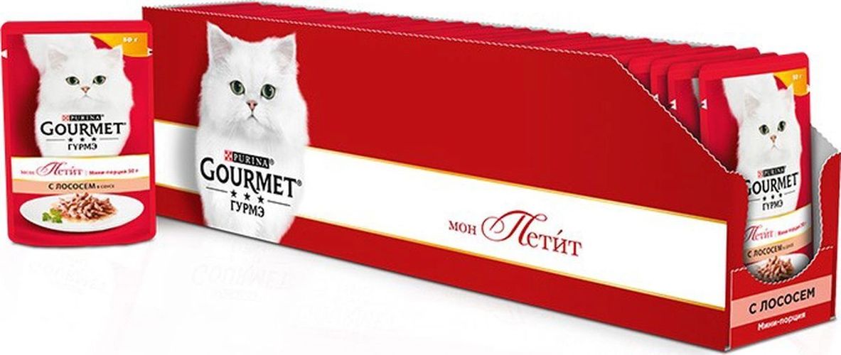 Настоящие гурманы знают, что ничто не сравнится с восхитительным вкусом только что приготовленного блюда. Именно тогда изысканное сочетание превосходных ингредиентов раскрывается наиболее ярко. Ваши питомцы достойны вкусного питания - аппетитного обеда из нежнейших кусочков мяса из только что открытого пакетика. Особый формат упаковки Gourmet "Mon Petit" (50 г) удобен тем, что содержит порцию оптимального размера. Это позволяет вашему пушистому гурману доесть все сразу до последнего кусочка, наслаждаясь пиком вкуса великолепного продукта. Больше не придется хранить остатки в холодильнике и на следующий день уговаривать своего питомца все это съесть. Ведь он, как настоящий гурман, понимает, что вкусно только то, что сразу же оказывается у него на тарелке. Вы можете быть уверены - ваш гурман оценит изысканное сочетание высококачественных ингредиентов, бережно приготовленных в аппетитном соусе.Состав: мясо и продукты переработки мяса, экстракт растительного белка, рыба и продукты переработки рыбы (в том числе лосось 4%), минеральные вещества, сахара, красители, дрожжи, витамины. Добавленные вещества: витамин A 732 МЕ/кг; витамин D3 112 МЕ/кг; железо 8,4 мг/кг; йод 0,21 мг/кг; медь 0,73 мг/кг; марганец 1,6 мг/кг; цинк 15 мг/кг.Пищевая ценность в 100 г: влажность 81,4%, белок 12,3%, жир 2,8%, сырая зола 1,6%, сырая клетчатка 0,07%.Товар сертифицирован.