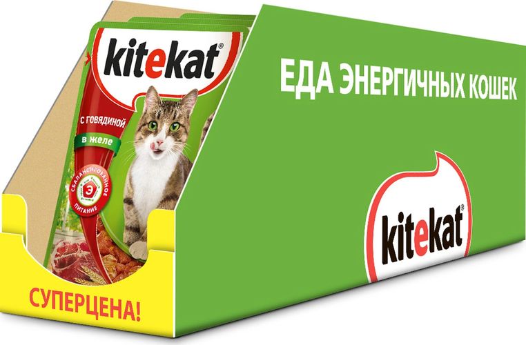 Консервы "Kitekat" - это порция сочных кусочков с говядиной в желе, приготовленных по особому рецепту. В основе корма формула сбалансированного питания, которая содержит белки, минералы, витамины, таурин и животные жиры. Порадуйте вашего питомца - в каждой порции только качественные продукты, как и те, что на вашей кухне: мясные ингредиенты, злаки и жиры животного происхождения. Все натуральные свойства сохранены и правильно сбалансированы для энергии и здоровья вашего кота. В упаковке 28 паучей по 85 г. Товар сертифицирован.