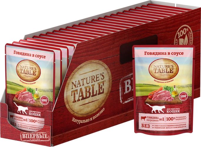 "Nature's Tablе" - это натурально и полезно! Рацион "Nature's Tablе" говядина в соусе содержит на 100% натуральные ингредиенты самого высокого качества, получаемые от проверенных поставщиков: - ингредиент № 1 – говядина – богатый источник белка и железа, а также незаменимых аминокислот, что является основой здорового рациона кошки и главным источником ее энергии и сил; - Натуральные овощи: мякоть сахарной свеклы, морковь, шпинат и другие содержат пищевые волокна для улучшения пищеварения и поддержания микрофлоры; - Подсолнечное масло и рыбий жир – источники омега-3 и омега-6 кислот, витаминов А, D, E для естественного здоровья кожи и блестящей шерсти; - БЕЗ сои, искусственных красителей, усилителей вкуса и консервантов. "Nature's Tablе" – вся польза природы для вашей кошки, чтобы она радовала вас здоровьем и красотой день за днем! Состав: говядина, курица, индейка, масла и жиры, злаки, витамины и минеральные вещества, овощи (сухая мякоть сахарной свеклы, морковь, томаты, шпинат). Наличие нескольких видов протеинов (говядина, курица, индейка) обеспечивает сбалансированную формулу рациона. Не содержит сои, искусственных красителей, усилителей вкуса и консервантов.