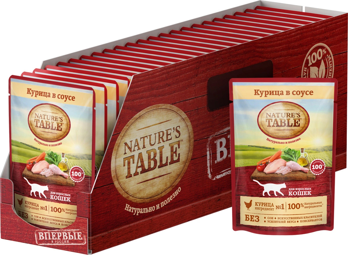 "Nature's Tablе" - это натурально и полезно! Рацион "Nature's Tablе" курица в соусе содержит на 100% натуральные ингредиенты самого высокого качества, получаемые от проверенных поставщиков: - ингредиент № 1 – курица – источник животного белка с высокой усвояемостью и основа здорового рациона кошки; - натуральные овощи и злаки содержат углеводы и клетчатку для здорового пищеварения; - подсолнечное масло и рыбий жир – источники омега-3 и омега-6 кислот, витаминов А, D, E для естественного здоровья кожи и блестящей шерсти; - БЕЗ сои, искусственных красителей, усилителей вкуса и консервантов. "Nature's Tablе"– вся польза природы для вашей кошки, чтобы она радовала вас здоровьем и красотой день за днем! Состав: курица, масла и жиры, злаки, витамины и минеральные вещества, овощи (сухая мякоть сахарной свеклы, морковь, томаты, шпинат). Не содержит сои, искусственных красителей, усилителей вкуса и консервантов.