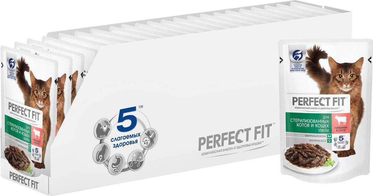 В рационе Perfect Fit Sterile мы учли потребности организма кошки, прошедшей стерилизацию. Специальная рецептура для контроля рН мочи и высокое содержание влаги в составе способствуют поддержанию здоровья мочевыводящих путей, а сниженный уровень жиров и особые рекомендации по кормлению позволят следить за оптимальным балансом веса. Вашу кошку следует кормить кормом комнатной температуры.Для взрослой кошки среднего веса (4кг) необходимо 3-4 пакетика в день. Состав: мясо и субпродукты минимум 34%(в том числе говядина), злаки, минеральные вещества, витамины, метионин, таурин, L-карнитин, натуральный краситель бета-каротин.Содержание питательных веществ (100 г): белки - 8,0 г; жиры - 3,5 г; зола - 1,5 г; клетчатка - 0,1 г; витамин А - не менее 200 МЕ; витамин Е - не менее 1,2 мг; влага - 83 г.