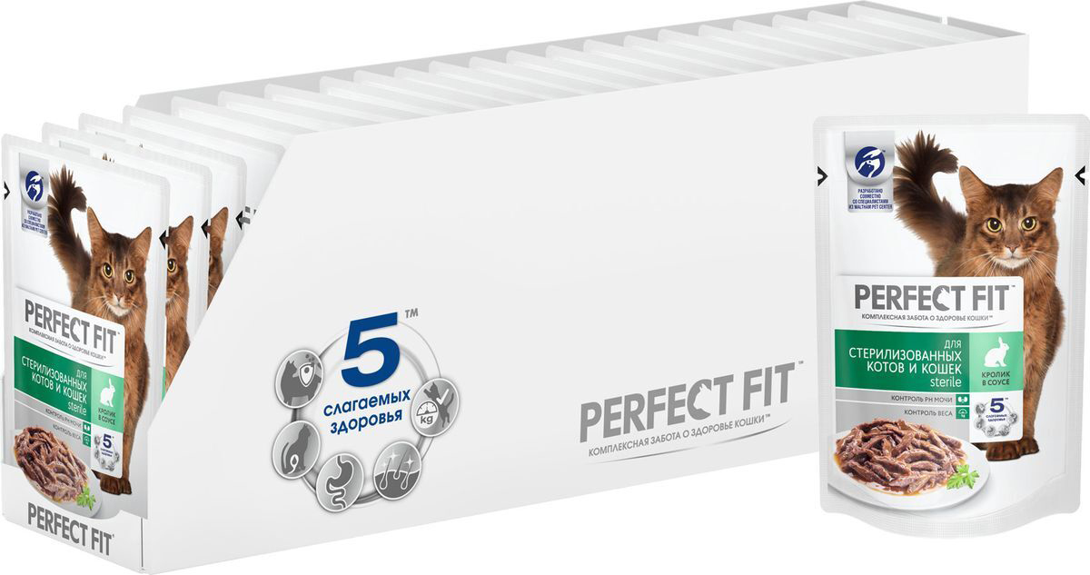 В рационе Perfect Fit Sterile мы учли потребности организма кошки, прошедшей стерилизацию. Специальная рецептура для контроля рН мочи и высокое содержание влаги в составе способствуют поддержанию здоровья мочевыводящих путей, а сниженный уровень жиров и особые рекомендации по кормлению позволят следить за оптимальным балансом веса. Вашу кошку следует кормить кормом комнатной температуры.Для взрослой кошки среднего веса (4кг) необходимо 3-4 пакетика в день. Состав: мясо и субпродукты минимум 34%(в том числе кролик), злаки, минеральные вещества, витамины, метионин, таурин, L-карнитин, натуральный краситель бета-каротин.Содержание питательных веществ (100 г): белки - 8,0 г; жиры - 3,5 г; зола - 1,5 г; клетчатка - 0,1 г; витамин А - не менее 200 МЕ; витамин Е - не менее 1,2 мг; влага - 83 г.