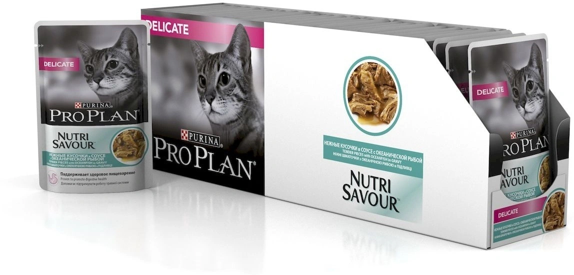 Консервы Pro Plan "Nutri Savour" помогают уменьшить кожные реакции, связанные с пищевой непереносимостью. Нежные кусочки в пикантном соусе очень привлекательны для кошек благодаря запатентованной технологии. Доказано: способствует улучшению пищеварения благодаря содержанию инулина, пребиотика, который помогает сбалансировать кишечную флору кошек с повышенной чувствительностью. Состав: мясо и продукты переработки мяса, экстракты растительных белков, рыба и продукты переработки рыбы (в том числе океаническая рыба 4%), растительные и животные жиры, продукты переработки растительного сырья, красители, сахара, витамины. Добавленные вещества (МЕ/кг): витамин А 1058, витамин D3 148, витамин Е 320, мг/кг: таурин 456, железо 10,1, йод 0,38, медь 0,96, марганец 1,76, цинк 27,35, селен 0,022. Гарантируемые показатели: влажность 78%, белок 12,6%, жир 3,8%, сырая зола 2,3%, сырая клетчатка 0,3%, омега-3 жирные кислоты 0,1%, омега-6 жирные кислоты 1,1%.