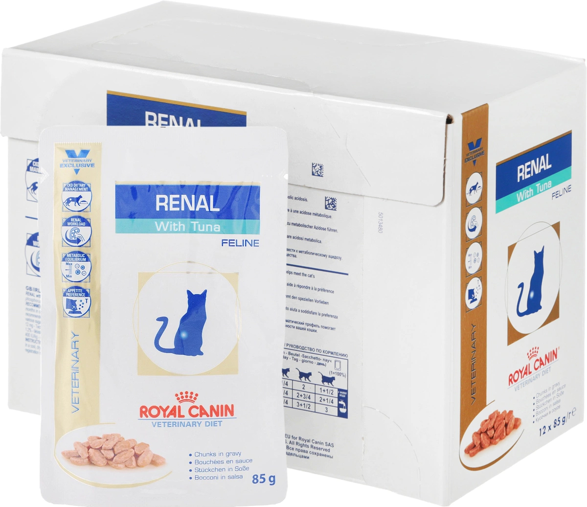 Консервы Royal Canin "Renal Feline" предназначены для кошек с почечной недостаточностью. Показания: - Хроническая почечная недостаточность (ХПН); - Профилактика рецидивов образования камней оксалата кальция у кошек с ослабленной функцией почек; - Профилактика рецидивов уролитиаза (уратов, цистинов), вызванных снижением уровня рН мочи; Противопоказания: - Беременность, лактация, рост. Длительность курса применения: Минимальный срок назначения диетотерапии составляет 6 месяцев. По истечении этого времени необходимо повторное общее обследование. Если повреждены 3/4 нефронов почек, болезнь приобретает необратимый характер, и диетотерапию назначают для применения в течение всей жизни кошки. Особенности: - Диетологическое лечение ХПН. Формула продуктов специально разработана для поддержания почечной функции при ХПН. Продукты отличаются низким содержанием фосфора, содержат комплекс антиоксидантов, жирные кислоты ЕРА и DHA. При ХПН почки теряют способность надлежащим образом выводить фосфор. Низкое содержание фосфора в продукте способствует замедлению развития болезни. При кормлении диетическим кормом с адаптированным содержанием рыбьего жира (источника незаменимых жирных кислот ЕРА и DHA) повышается скорость клубочковой фильтрации. - Снижение нагрузки на почки. Чрезмерная нагрузка на почки может спровоцировать уремический криз. Высокое качество и адаптированное содержание белков способствуют снижению нагрузки на почки. Если содержание белка в рационе значительно превышает минимальные потребности, при сниженной экскреторной функции почек продукты распада азота накапливаются в биологических жидкостях. - Метаболическое равновесие. ХПН может привести к метаболическому ацидозу, поэтому в состав продуктов входят подщелачивающие вещества. Почки играют важнейшую роль в поддержании кислотно-щелочного баланса. При нарушенной функции почек их способность к выведению ионов водорода и реабсорбции ионов бикарбоната снижена, в связи с чем высок риск метаболического ацидоза. - Вкусовые предпочтения. Специально разработанный ароматический профиль помогает удовлетворить особые вкусовые предпочтения кошки. У животных с ХПН довольно часто наблюдается потеря аппетита, непереносимость корма, анорексия. Состав: свинина, курица, мясные субпродукты, тунец, рыбные субпродукты, злаки, подсолнечное масло, минеральные вещества (в том числе карбонат кальция, цитрат калия), витамины. Содержание питательных веществ (на 100 г): белки 6,6 г, жиры 6 г, клетчатка пищевая 1,2 г, хлориды 0,13 г, кальций 0,12 г, фосфор 0,08 г, натрий 0,08 г, калий 0,18 г, магний 0,015, сера 0,13, витамин D 400 ME, EPA и DHA 0,13 г. Добавки (на кг): D3 240 МЕ, железо 4 мг, йод 0,17 мг, медь 1,3 мг, марганец 1,2 мг, цинк 12 мг. Энергетическая ценность (на 100 г): 94,3 ккал. Товар сертифицирован.