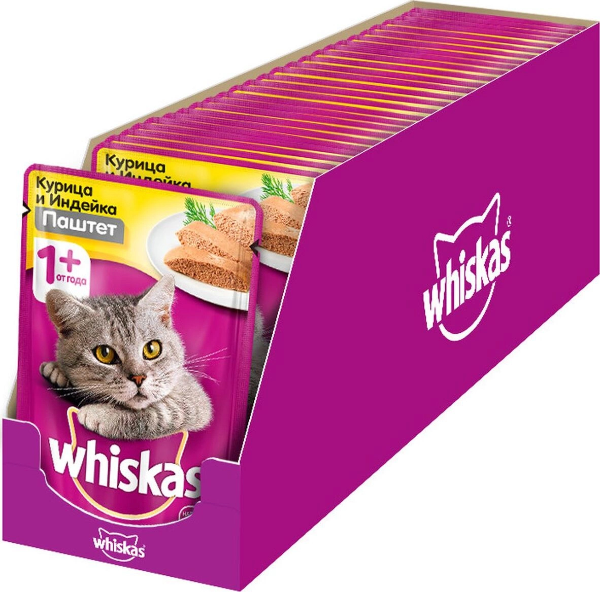 Полнорационный сбалансированный корм для кошек "Whiskas" приготовлен из тщательно отобранного мяса. Он содержит все витамины и минералы, необходимые для ежедневного питания вашей кошки. В рацион домашнего любимца нужно обязательно включать консервированный корм, ведь его главные достоинства - высокая калорийность и питательная ценность. Консервы лучше усваиваются, чем сухие корма. Также важно, чтобы животные, имеющие в рационе консервированный корм, получали больше влаги. Не содержит сои, консервантов, ароматизаторов, искусственных красителей и усилителей вкуса. Состав: мясо и субпродукты (в том числе курица минимум 20%, индейка минимум 6%), таурин, витамины, минеральные вещества. Пищевая ценность в 100 г: белки - 8 г, жиры - 4 г, зола - 1,8 г, клетчатка - 0,3 г, витамин А - не менее 150 МЕ, витамин Е - не менее 1,0 мг, влага - 85 г. Энергетическая ценность в 100 г: 70 ккал/293 кДж. В упаковке 24 пакетика по 85 г. Товар сертифицирован.