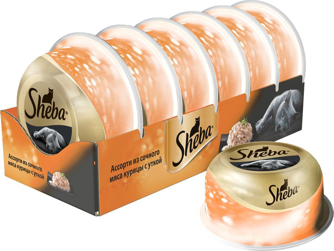 В изысканном блюде от Sheba® сочное утиное мясо сочетается с легким филе цыпленка, а соус великолепно подчеркивает тонкую игру этих вкусов.Упаковка 80 г предназначена для одного приема пищи в качестве дополнительного рациона, что соответствует ~ 30% суточной энергетической потребности кошки весом 4 кг. Кошку следует кормить кормом комнатной температуры. Рекомендуется сочетать с полнорационными кормами Sheba.