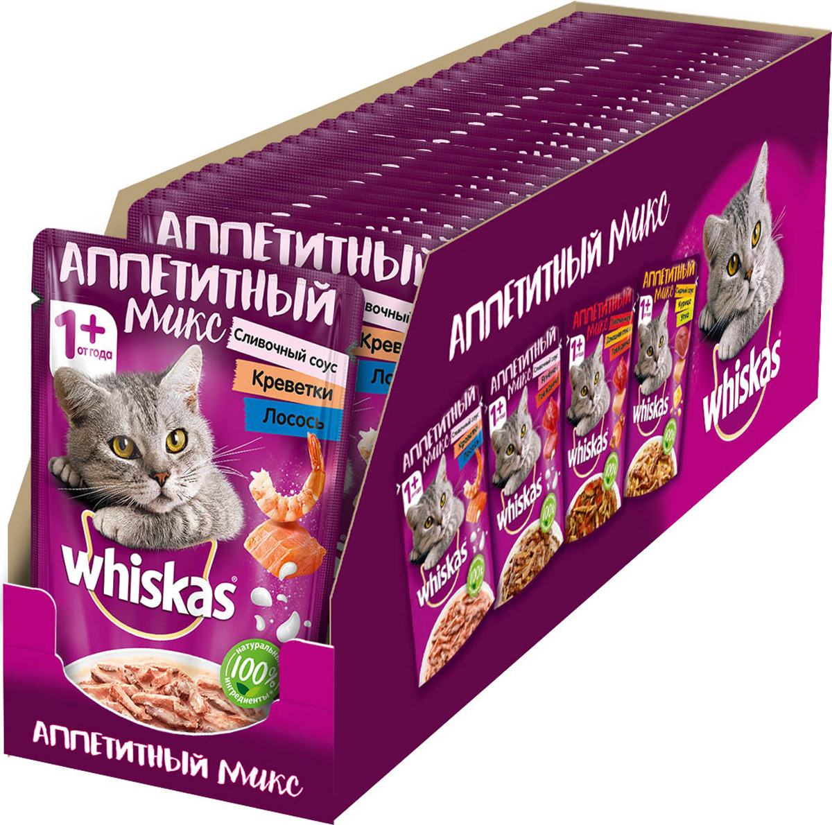 Креветки, лосось и сливочный соус — сразу все, о чем мечтала ваша кошка, в новой коллекции сбалансированных блюд WHISKAS® Аппетитный микс. В каждом из паучей содержится три основных ингредиента: разные виды мяса или морепродуктов смешиваются в нежнейшем соусе или желе, чтобы вы воплощали мечты своих любимцев. WHISKAS® для взрослых кошек это:• Оптимальный баланс питательных веществ для полноценной жизни.• Все необходимое для поддержания здоровья: Омега-6, кальций, фосфор и таурин, витамин Е, цинк.WHISKAS® рекомендует сочетать разные форматы корма в рационе Вашей кошки. Утром и вечером Вашей любимице нужно давать влажный рацион, а в течение дня — сухой. Такой тип питания позволит объединить преимущества каждого из форматов.Преимущества сухих рационов: • Профилактика заболеваний ротовой полости• Профилактика заболеваний желудочно-кишечного трактаПреимущества влажных рационов:• Профилактика ожирения• Профилактика заболеваний мочевыводящей системыНужно помнить, что смешивать в одной миске сухой и влажный рационы не рекомендуется. Кроме того, у Вашей любимицы всегда должен быть доступ к чистой питьевой воде.Хранить при температуре от +4 *С до +35 *С и относительной влажности воздуха не более 75 %.