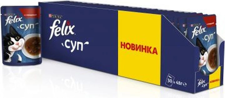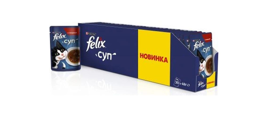 Суп на первое! Идеальное дополнение к основному рациону рациону вашего любимого питомца! Новая вкуснятина от Felix с большим количеством соуса и крупными кусочками порадует всех находчивых котов страны!Состав: мясо и продукты его переработки (из которых говядина 4%), экстракты растительного белка, рыба и продукты ее переработки, аминокислоты, минеральные вещества, загустители, сахара, продукты переработки растительного сырья, красители, дрожжи. Гарантируемые показатели: влажность: 87,5%, белок: 7,5%, содержание жира: 1,5%, сырая зола: 1,8%, сырая клетчатка: 0,2%.Рекомендации по кормлению: Для кошки весом 4 кг, рекомендуется давать один пакетик супа в день в дополнение к основному рациону. Ради сохранения здорового веса Вашей кошки, пожалуйста, соблюдайте данные рекомендации по кормлению.