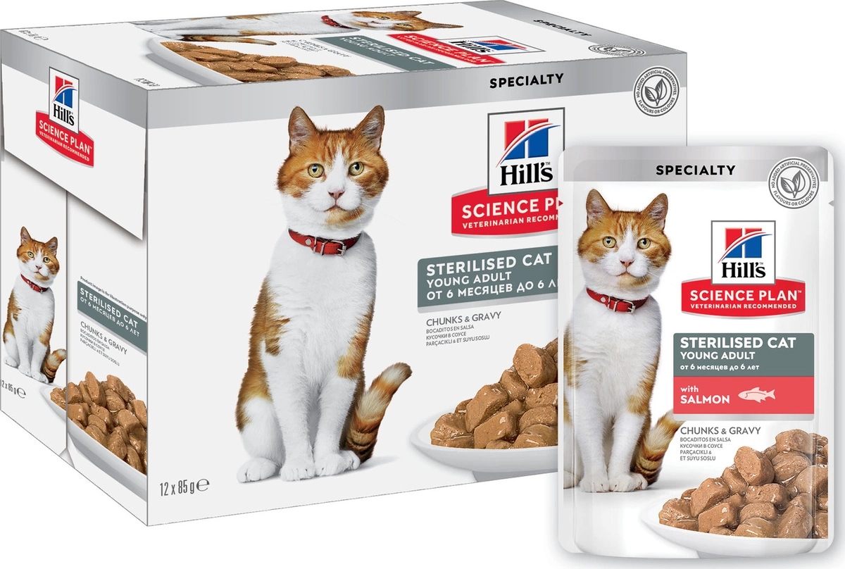 Влажный корм Hill's Science Plan для молодых стерилизованных кошек и кастрированных котов, пауч с лососем в соусе, 85 г*12штСтерилизованные кошки или кастрированные коты, склонны к набору избыточного веса, поскольку у них увеличивается аппетит и снижается активность. Также у них увеличивается вероятность возникновения проблем с функциями почек и мочевого пузыря. Влажный корм для стерилизованных кошек и кастрированных котов с нежными кусочками в соусе, с лососем Hill's Science Plan Sterilised Cat содержит уникальную формулу контроля веса, поддерживающую идеальный вес, а также сбалансированный набор минералов для поддержания здоровья функций почек и мочевого пузыря. - Влажный корм в форме пауча для стерилизованных кошек и кастрированных котов - Уникальная формула контроля веса с L-карнитином, поддерживает энергетические потребности кошек и котов и помогает сохранить идеальный вес - Сбалансированный набор минералов для поддержания функций мочевого пузыря и почек - Низкий уровень жира и высокое содержание L-лизина для поддержания энергичности - Натуральные легко усваиваемые ингредиенты высокого качестваТщательно сбалансированное питание, разработанное для удовлетворения потребностей стерилизованных кошек, с превосходным вкусом лосося.Назначение:Стерилизованным кошкам от 6 месяцев до 6 лет.Не рекомендуется: Для котят и беременных или кормящих кошек. Во время беременности или кормления нужно сменить корм на Hill's Science Plan Healthy Development для котят (влажный или сухой корм).Перевод на данный корм:Скорректируйте количество корма в соответствии с размером вашего питомца для поддержания оптимального веса. Если вы сомневайтесь, проконсультируйтесь с вашим ветеринарным врачом. Пробуете этот рацион впервые? В течение 7 дней постепенно увеличивайте содержание нового корма по отношению к прежнему до момента его полного замещения.Обеспечьте питомцу постоянный доступ к свежей воде.Пищевые потребности вашего питомца могут меняться с возрастом. Уточняйте у вашего ветеринарного специалиста подходит ли текущий рацион вашему питомцу на каждом осмотре. Содержание мяса: Лосось 4%Состав на упаковке:Мясо и производные животного происхождения, рыба и рыбные производные, производные растительного происхождения, яйцо и его производные, овощи, экстракты растительного белка, различные сахара, злаки, масла и жиры, минералы.Питательные вещества:Белок 7,9%, Жир 2,8%, Клетчатка 1,1%, Зола 1,3%, Влага 81,0%, Кальций 0,20%, Фосфор 0,15%, Натрий 0,08%, Калий 0,16%; на кг: Витамин А 26 074МЕ, Витамин D3 277МЕ, Витамин E 123мг, Витамин С 19мг, Бета-каротин 0,22мг.Добавки на кг:3b103 (Железо) 10,3мг, 3b202 (йод) 0,3мг, 3b405 (медь) 1,7мг, 3b502 (Марганец) 2,3мг, 3b603 (цинк) 26,5мг; окрашено натуральной карамелью.Без искусственных ароматизаторов, красителей и консервантов.Калорийность: Ккал/100 г: 72Срок годности: 18 месяцевТип упаковки: ПаучУсловия хранения: Избегать попадания влаги. Хранить в сухом, прохладном месте, недоступном для детей и домашних животных.