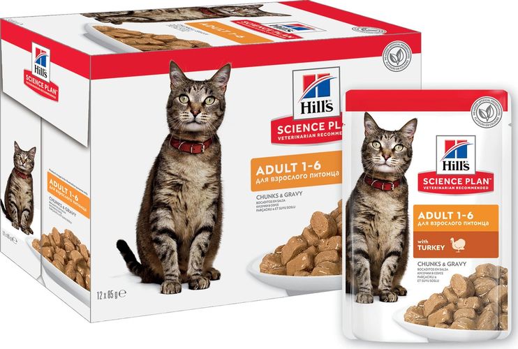 Ваша взрослая кошка нуждается в корме, который поддерживает здоровое пищеварение, блестящую шерсть, мышечную массуи здоровый иммунитет. Влажный корм для взрослых кошек с индейкой, в форме пауча HILL'S SCIENCE PLANизготовлен из высококачественных, легко усваиваемых ингредиентов и специально создан для удовлетворения энергетических потребностей взрослых кошек. корм для кошек и котов из высококачественных ингредиентов HILL'S SCIENCE PLAN содержит Витамин Е и Омега-6 жирные кислоты, которые помогают обеспечить здоровую кожу и шерсть. Благодаря содержанию качественных белков этот корм для кошек также помогает поддерживать мышечную массу вашей кошки. Также, влажный корм для кошек содержит таурин - необходимую аминокислоту для поддержания здоровья сердца, функции почек и мочевого пузыря. Мы с гордостью представляем вам новый образ любимого корма Hill's Science Plan. В некоторых из наших кормов также изменились названия, форма гранул и формулы. ?Влажный корм для взрослых кошек и котов для поддержания энергетических потребностей, содержит таурин, необходимый для здоровья сердца ?Качественные протеины помогают наращивать и поддерживать мышечную массу ?Содержит Витамин E и Омега-3 и -6 жирные кислоты для поддержания здоровой кожи и блестящей шерсти ?Сбалансированные минералы для поддержания функций почек и мочевого пузыря ?Натуральные ингредиенты высокого качестваПоддерживает иммунитет, здоровое пищеварение и мышечную массу у взрослых кошекНазначение: Взрослые кошки 1-6 лет.Не рекомендуется: Котят и беременных или кормящих кошек. Во время беременности или кормления нужно сменить корм на Hill's Science Plan для котят влажный или сухой корм.Длительность курса: Перевод на данный корм: Скорректируйте количество корма в соответствии с размером вашего питомца для поддержания оптимального веса. Если вы сомневайтесь, проконсультируйтесь с вашим ветеринарным врачом. Пробуете этот рацион впервые? В течение 7 дней постепенно увеличивайте содержание нового корма по отношению к прежнему до момента его полного замещения. Обеспечьте питомцу постоянный доступ к свежей воде. Пищевые потребности вашего питомца могут меняться с возрастом. Уточняйте у вашего ветеринарного специалиста подходит ли текущий рацион вашему питомцу на каждом осмотре. Во избежание удушья, храните открытую упаковку в месте недоступном для питомцев и детей.Рекомендация по кормлению: Следуйте рекомендациям по кормлению, указанным на упаковке. Скорректируйте количество корма в соответствии с размером вашего питомца для поддержания оптимального веса. Если у вас есть сомнения, обратитесь к ветеринарному специалисту. Пробуете этот корм впервые? В течение 7 дней постепенно увеличивайте содержание нового корма по отношению к прежнему до момента его полного замещения. У кошки всегда должен быть доступ к чистой питьевой воде! Потребности ваших питомцев в питании могут меняться с возрастом. Уточняйте у вашего ветеринарного специалиста подходит ли текущий рацион вашему питомцу на каждом осмотре.Калорийность: Ккал/100 г: 79