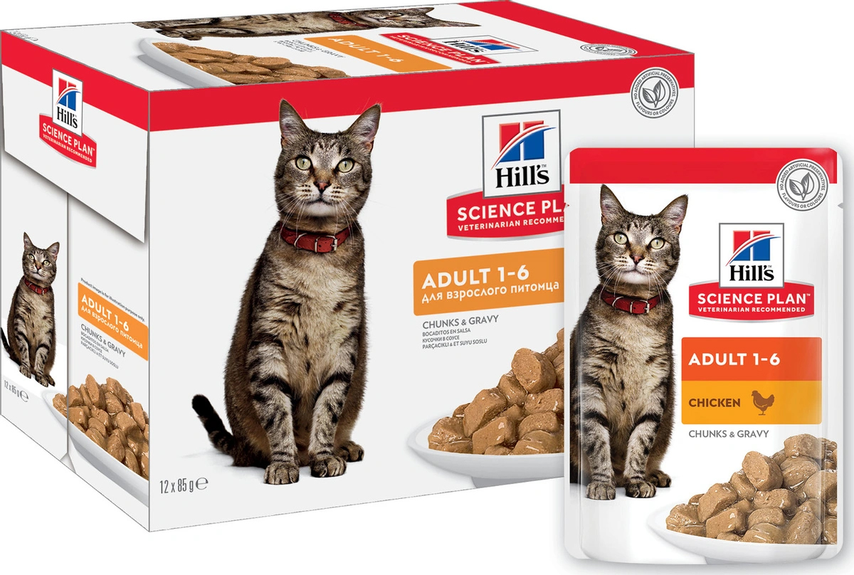Ваша взрослая кошка нуждается в корме, который поддерживает здоровое пищеварение, блестящую шерсть, мышечную массуи мускулатуру и здоровый иммунитет. Влажный корм для взрослых кошек в форме пауча HILL'S SCIENCE PLANизготовлен из высококачественных, легко усваиваемых ингредиентов и специально создан для удовлетворения энергетических потребностей взрослых кошек. корм для кошек и котов из высококачественных ингредиентов HILL'S SCIENCE PLAN содержит Витамин Е и Омега-6 жирные кислоты, которые помогают обеспечить здоровую кожу и шерсть. Благодаря содержанию качественных белков этот корм для кошек также помогает поддерживать мышечную массу вашей кошки. Также, влажный корм для кошек содержит таурин - необходимую кислоту для поддержания здоровья сердца, функции почек и мочевого пузыря. Мы с гордостью представляем вам новый образ любимого корма Hill's Science Plan. В некоторых из наших кормов также изменились названия, форма гранул и формулы. ?Влажный корм для взрослых кошек и котов для поддержания энергетических потребностей, содержит таурин, необходимый для здоровья сердца ?Качественные протеины помогают наращивать и поддерживать мышечную массу ?Содержит Витамин E и Омега-3 и -6 жирные кислоты для поддержания здоровья кожи и блестящей шерсти ?Сбалансированные минералы для поддержания функций почек и мочевого пузыря ?Натуральные ингредиенты высокого качестваПоддерживает иммунитет, здоровое пищеварение и мышечную массу у взрослых кошекНазначение: Взрослые кошки 1-6 лет.Не рекомендуется: Котят и беременных или кормящих кошек. Во время беременности или кормления нужно сменить корм на Hill's Science Plan для котят влажный или сухой корм.Длительность курса: Перевод на данный корм: Скорректируйте количество корма в соответствии с размером вашего питомца для поддержания оптимального веса. Если вы сомневайтесь, проконсультируйтесь с вашим ветеринарным врачом. Пробуете этот рацион впервые? В течение 7 дней постепенно увеличивайте содержание нового корма по отношению к прежнему до момента его полного замещения. Обеспечьте питомцу постоянный доступ к свежей воде. Пищевые потребности вашего питомца могут меняться с возрастом. Уточняйте у вашего ветеринарного специалиста подходит ли текущий рацион вашему питомцу на каждом осмотре. Во избежание удушья, храните открытую упаковку в месте недоступном для питомцев и детей.Рекомендация по кормлению: Следуйте рекомендациям по кормлению, указанным на упаковке. Скорректируйте количество корма в соответствии с размером вашего питомца для поддержания оптимального веса. Если у вас есть сомнения, обратитесь к ветеринарному специалисту. Пробуете этот корм впервые? В течение 7 дней постепенно увеличивайте содержание нового корма по отношению к прежнему до момента его полного замещения. У кошки всегда должен быть доступ к чистой питьевой воде! Потребности ваших питомцев в питании могут меняться с возрастом. Уточняйте у вашего ветеринарного специалиста подходит ли текущий рацион вашему питомцу на каждом осмотре.Калорийность: Ккал/100 г: 80