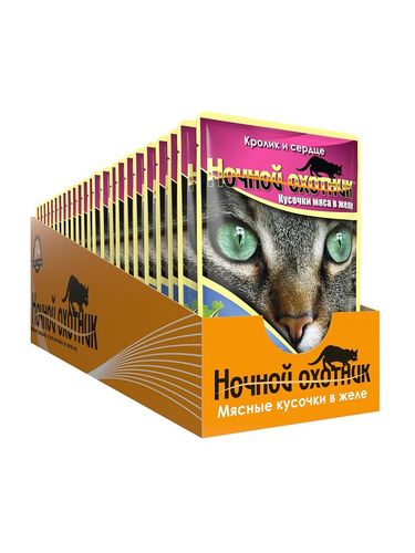 Консервы для взрослых кошек "Ночной охотник" с кроликом и сердцем в желе - полноценное сбалансированное питание для взрослых кошек. Изготовлены из натурального мяса, без содержания сои, консервантов и ГМО продуктов. В состав корма входят питательные вещества, белки, минеральные вещества, витамины, таурин и другие компоненты, необходимые кошке для ежедневного питания.Состав: мясо и субпродукты животного происхождения (в т.ч. мясо кролика не менее 10%, сердце не менее 10%), растительное масло, злаки, минеральные вещества, витамины А, D3, E (tocopherol), таурин.Пищевая ценность в 100 г. продукта: сырой белок – 8%, сырой жир – 3,5%, сырая зола – 2%, сырая клетчатка – 0,4%, кальций – 0,25%, фосфор – 0,3%, массовая доля влаги – 80%Энергетическая ценность: 80 кКал/100 г.Комплектация: 24 пакетика по 100г